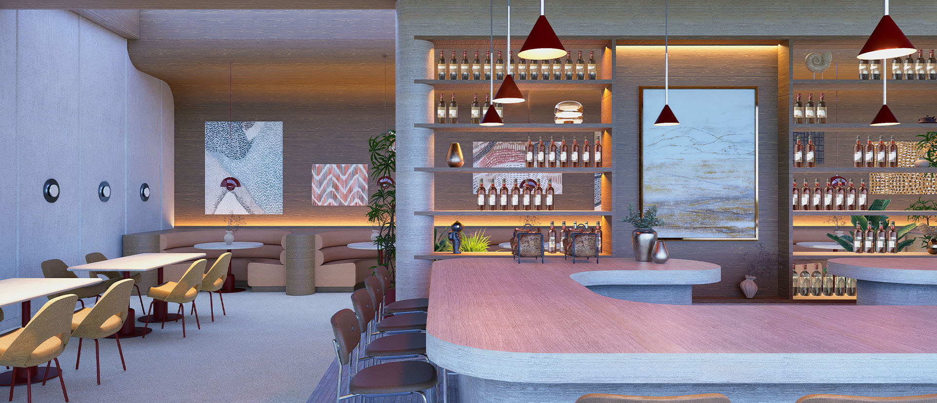 The interiors strike a harmonious balance of textures and tones: soft neutrals paired with rich woods, cozy seating with clean lines, and lush greenery that infuses the space with calm. Custom lighting highlights shelves of carefully selected bottles and décor, casting a golden glow that enhances Aura’s intimate and contemporary aesthetic.