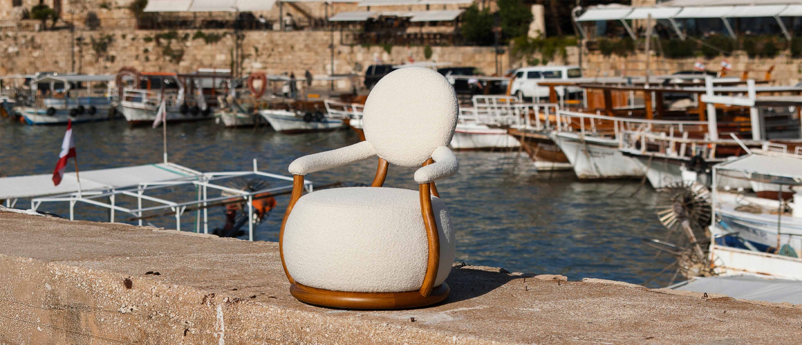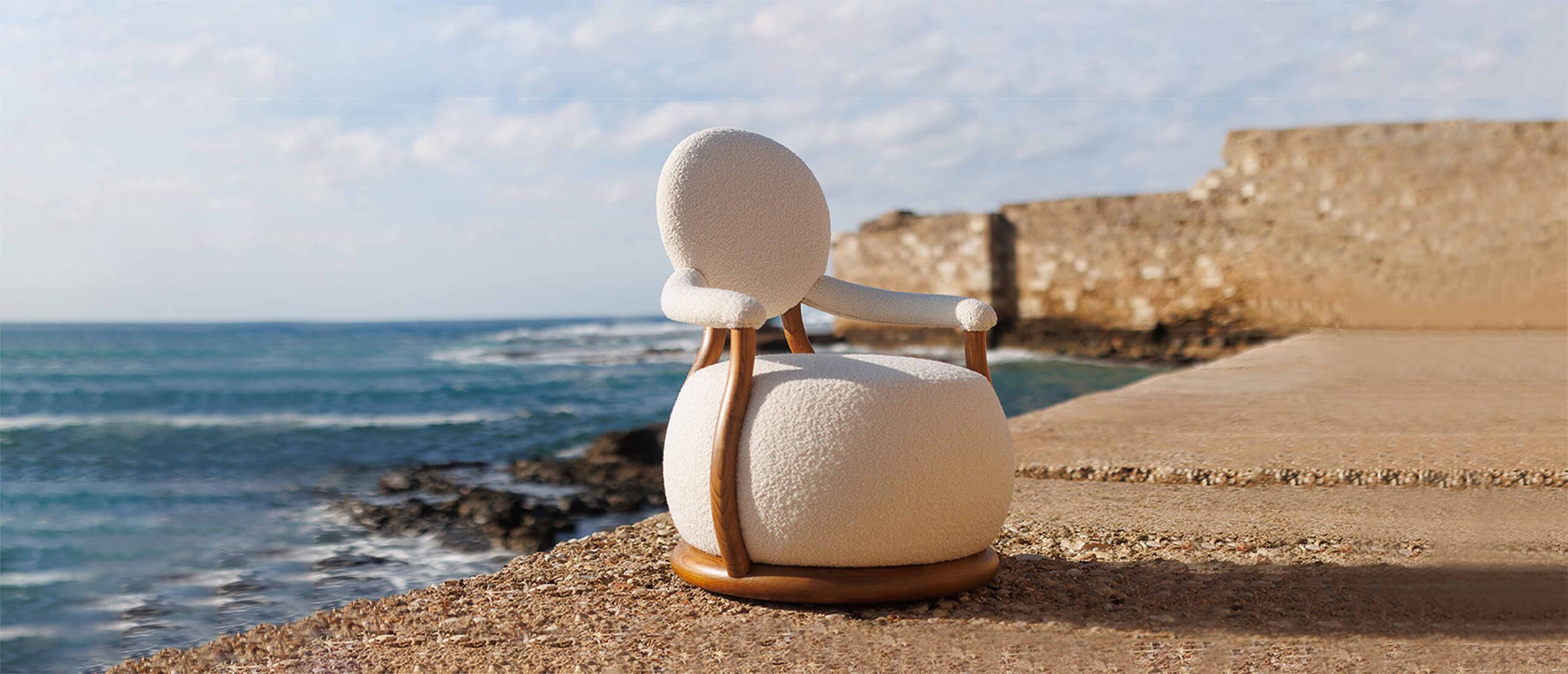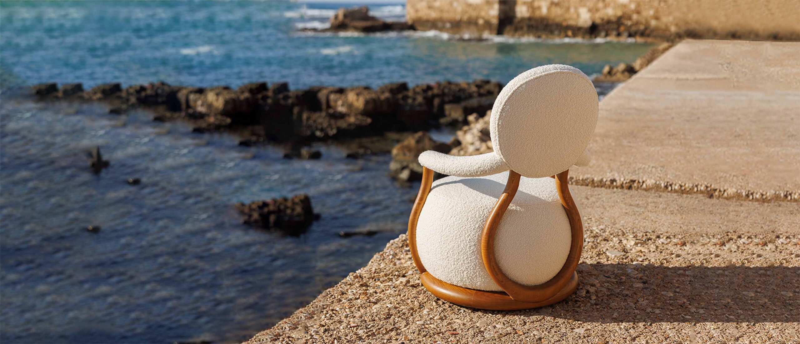 Materiality reinforces this balance between tenderness and strength. Upholstered in a soft wool bouclé, the chair invites touch and diffuses light, creating a sense of warmth close to the body. A sculptural oak frame bends around the upholstered form in smooth arcs, grounding the softness with calm structural stability.