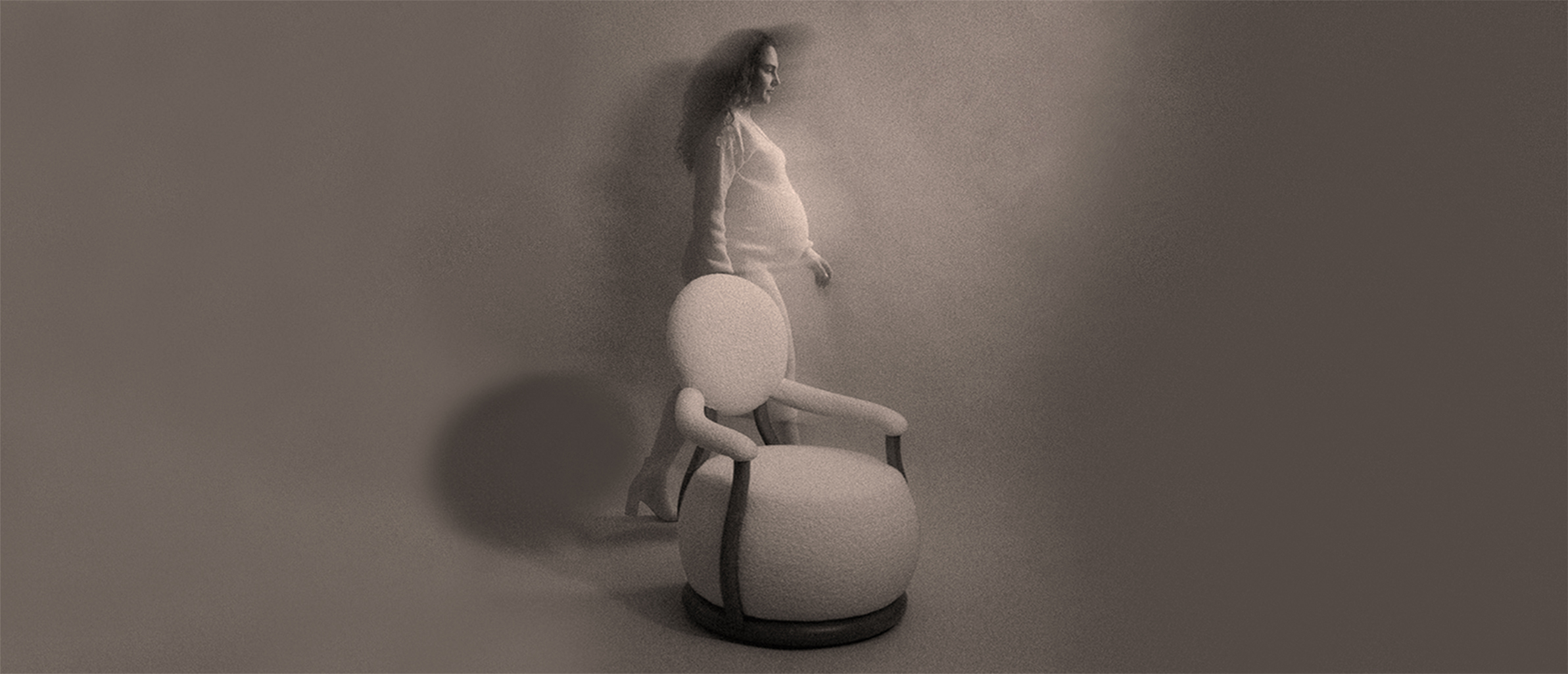 The chair’s silhouette is composed of generous rounded volumes that evoke warmth and protection. A full, grounded seat supports a softly spherical backrest, while the armrests extend forward in an open and welcoming gesture. Continuous curves define the design, creating a gentle visual rhythm that contrasts with the rigid geometries often found in furniture. The proportions subtly form a pear-like profile in which the seat carries more visual weight than the backrest, quietly referencing femininity and fertility.