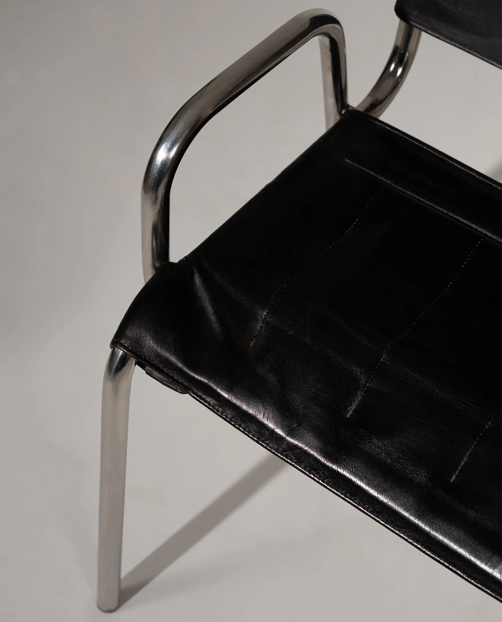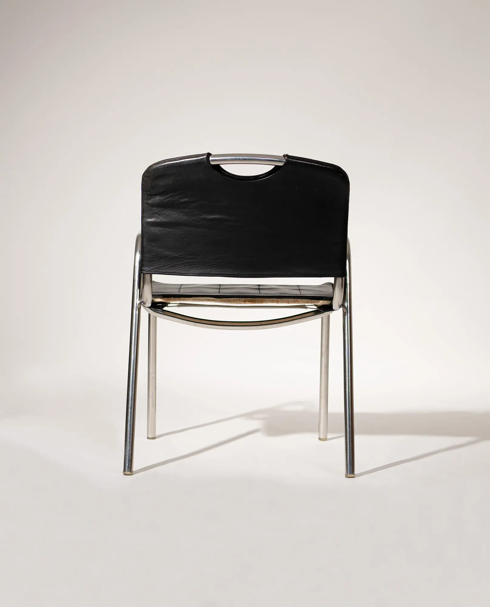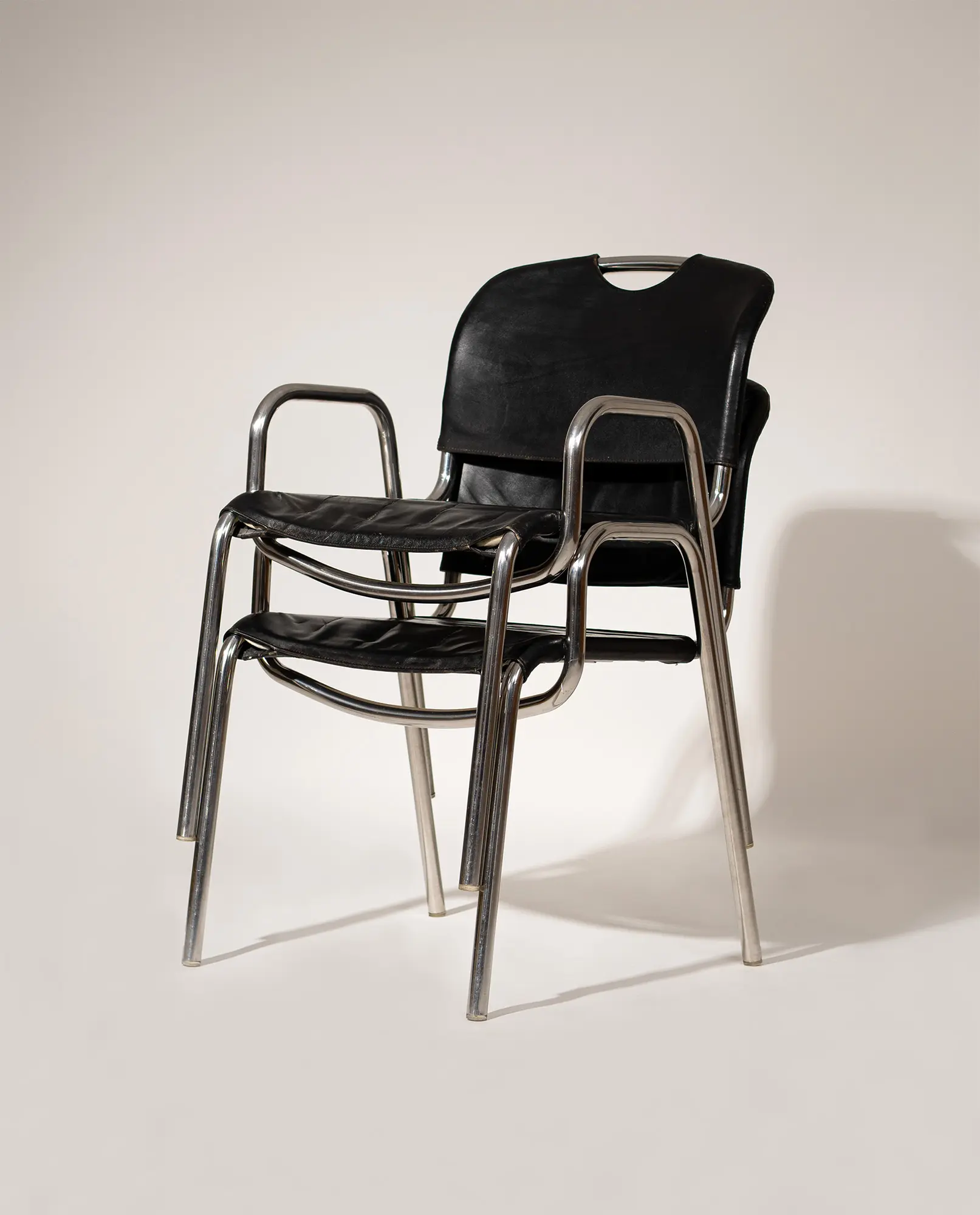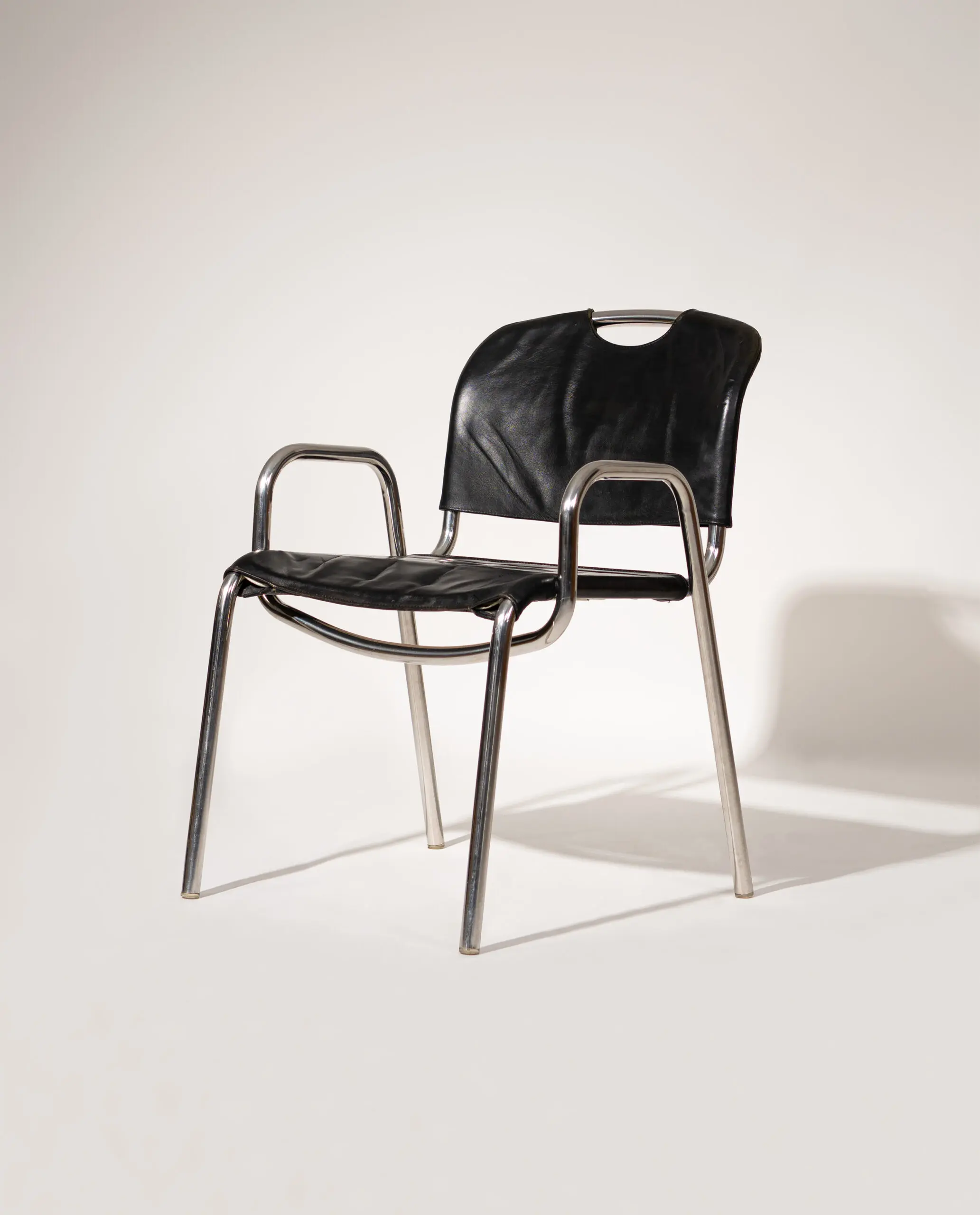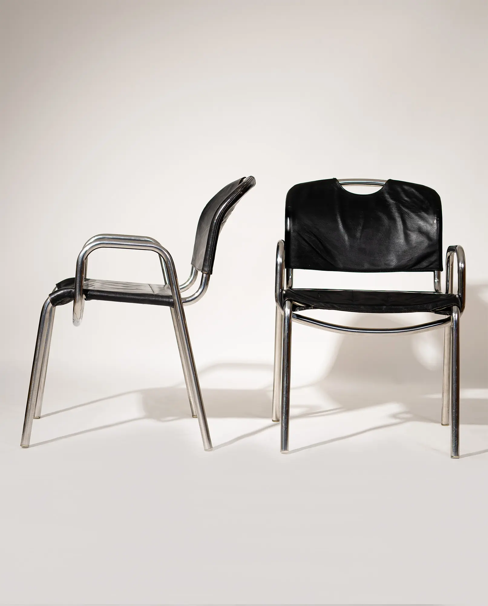 A pair of ‘Castiglia’ chairs, designed in 1968 by architect and designer Achille Castiglioni for Zanotta. The design highlights Castiglioni’s modern, functional approach, featuring chromed tubular steel frames with curved back legs and integrated arm supports. Black faux leather seats and backrests show a soft, appealing patina, while the distinctive crescent cutout on the upper backrest serves as a practical handhold.