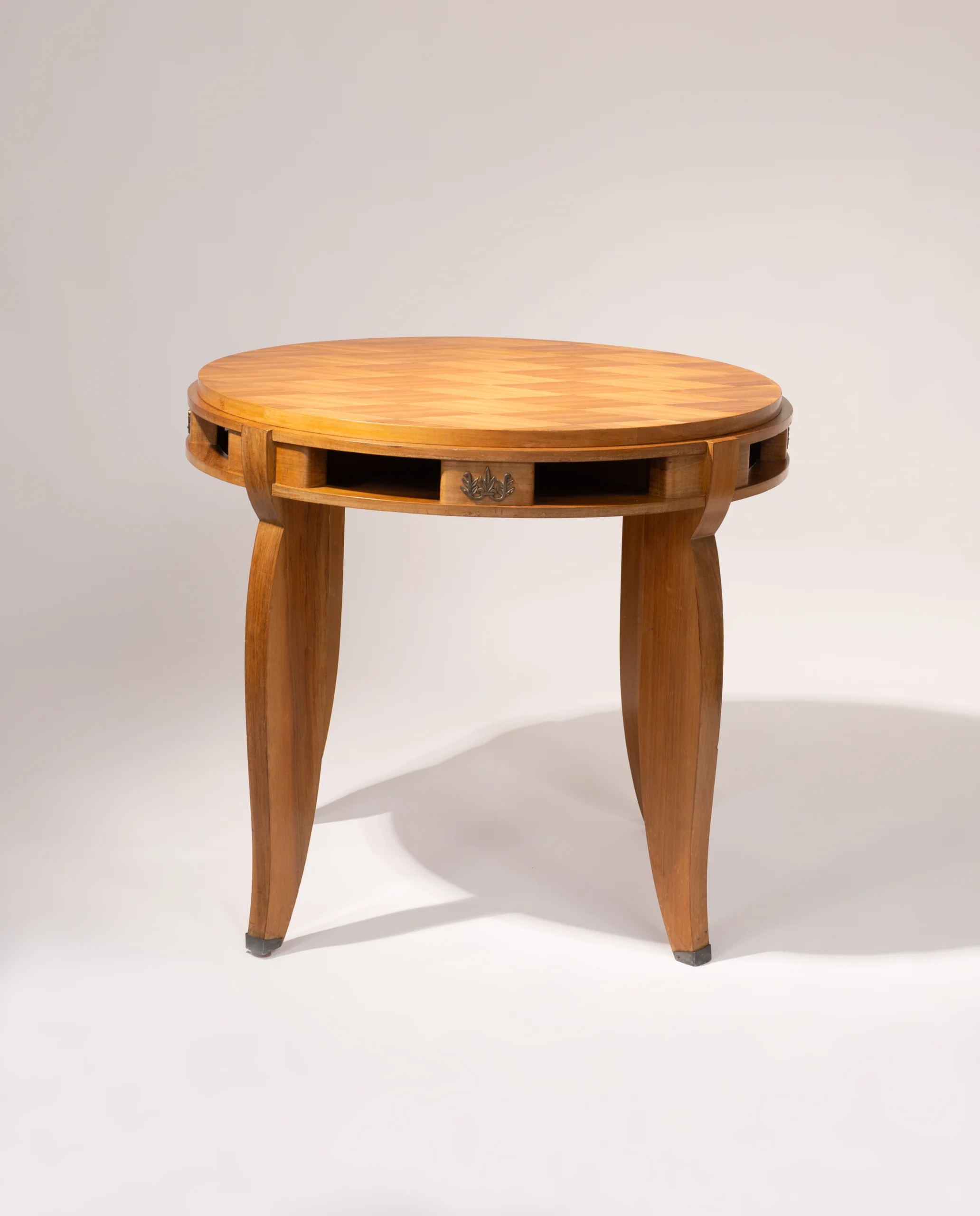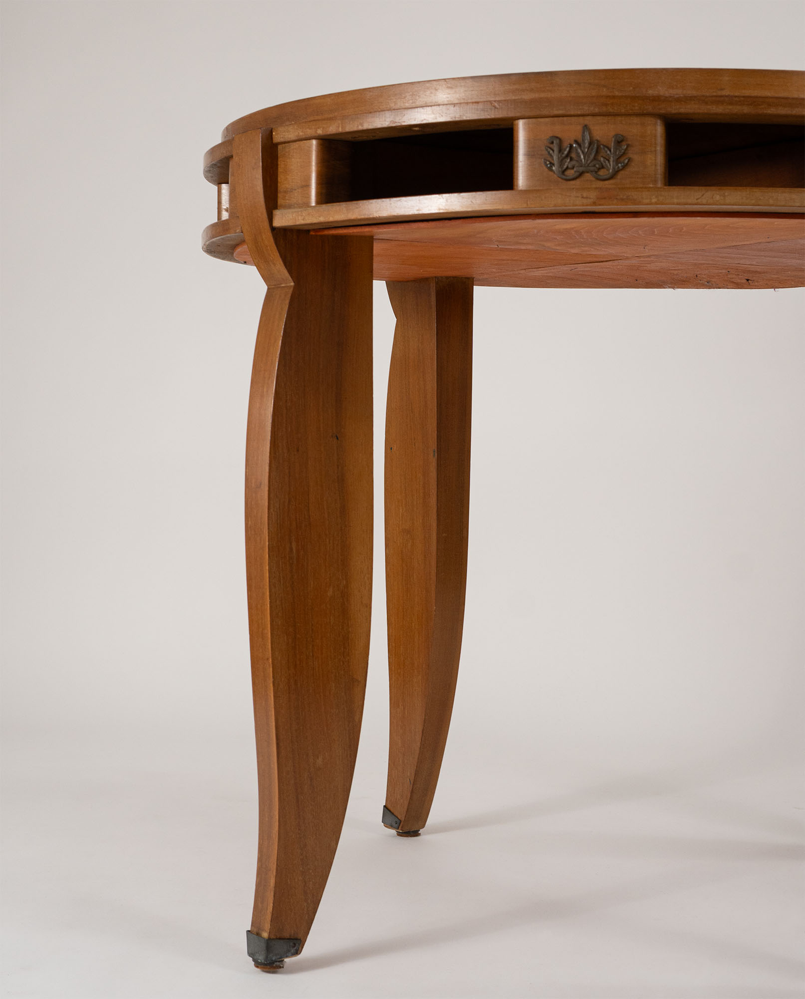 Art Deco guéridon, attributed to Jules Leleu, France, circa 1935. Made of rosewood and walnut veneer with inlaid marquetry, featuring four brass leaf floral details on the top. A refined example of elegant French Art Deco design.