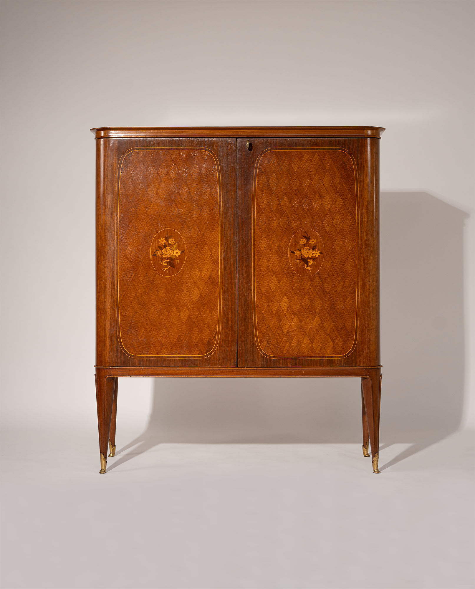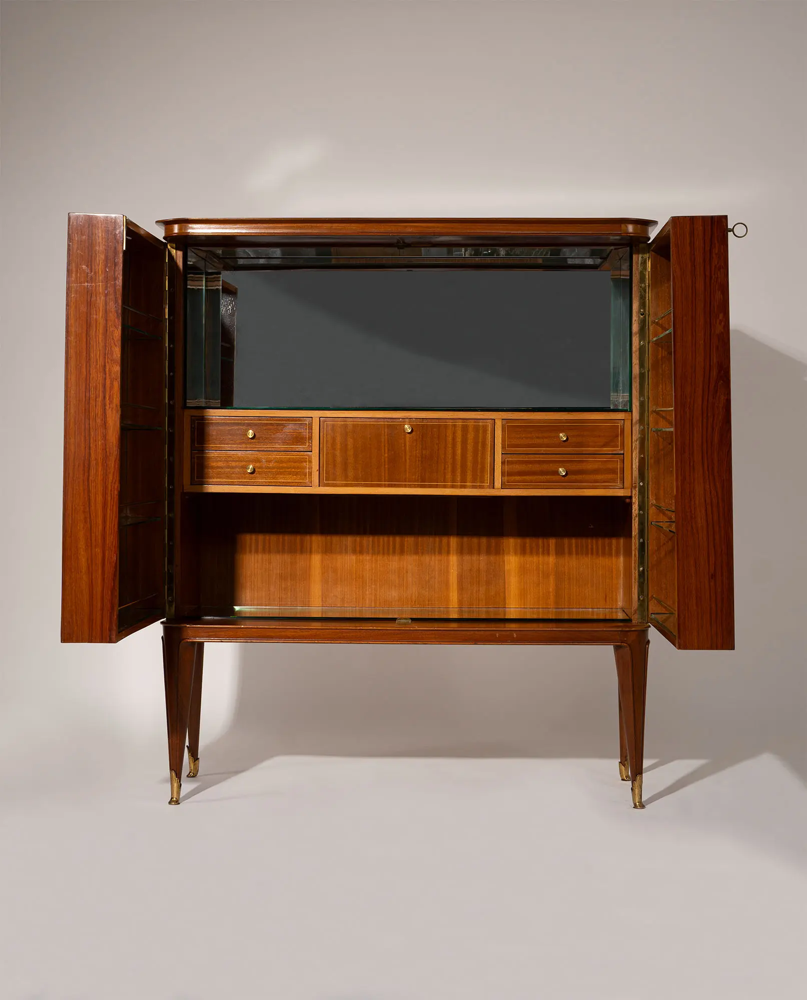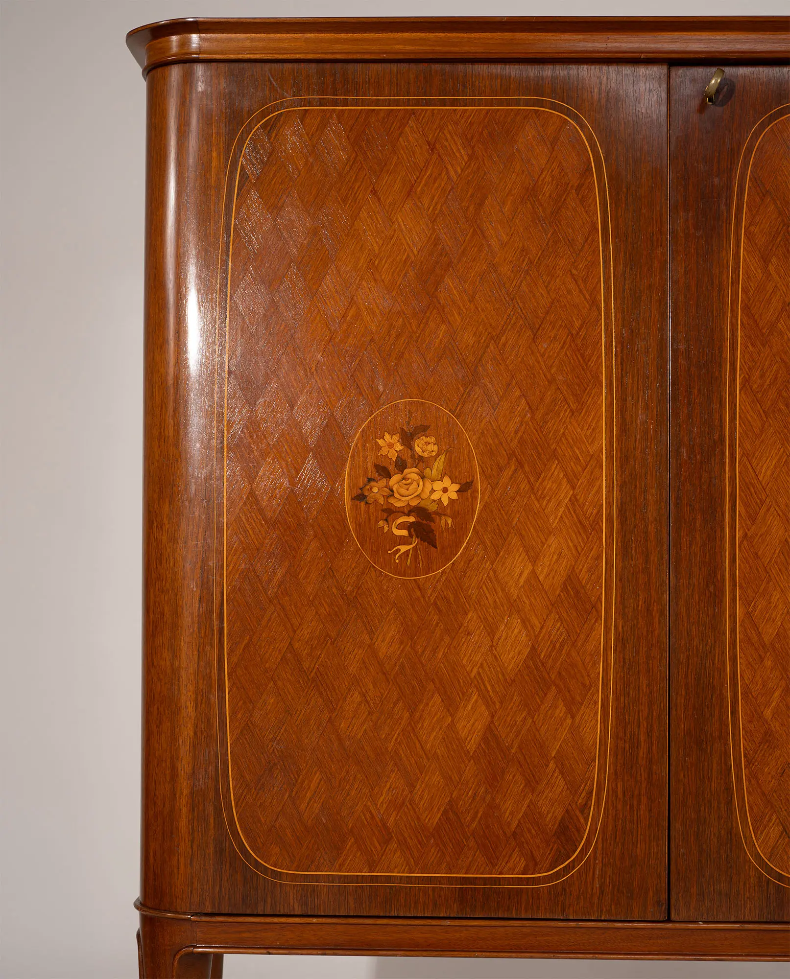 Bar cabinet, Italy, 1950s. In the style of Paolo Buffa. Executed in the Italian mid-century neoclassical style, this piece features a structure in inlaid woods of various types with floral marquetry decoration. The interior is lined in mirrored glass and finished with brass details and tips, while the cabinet rests on tapered legs with brass sabots.