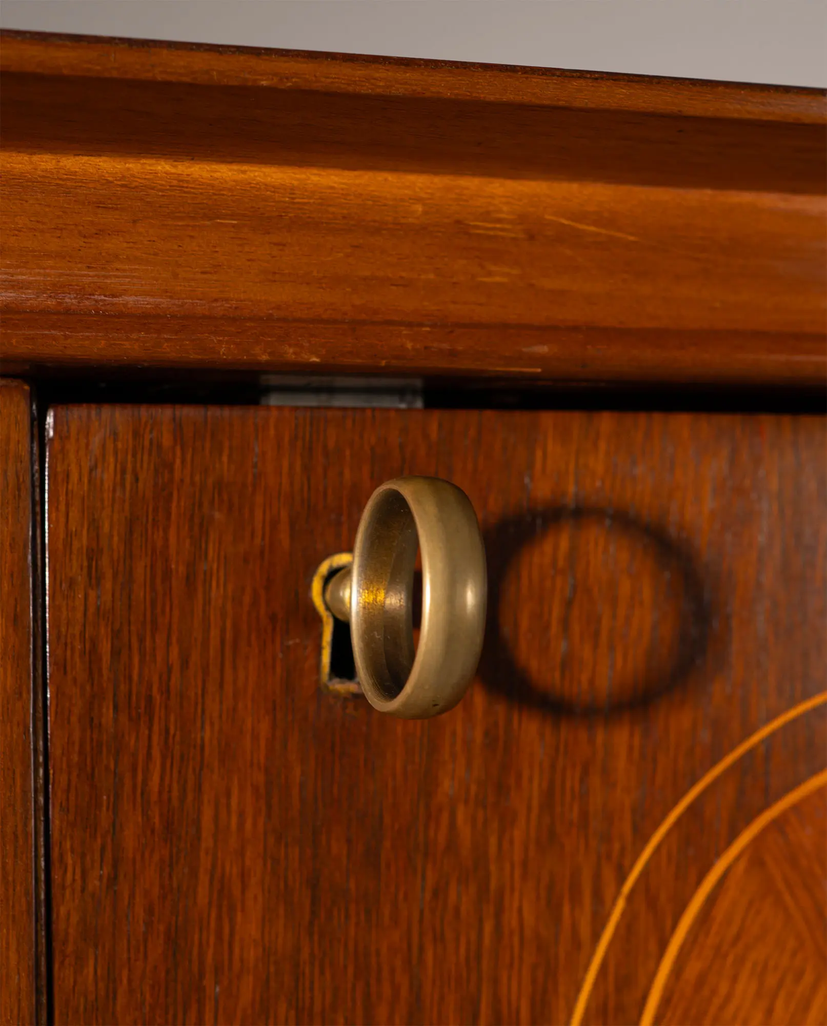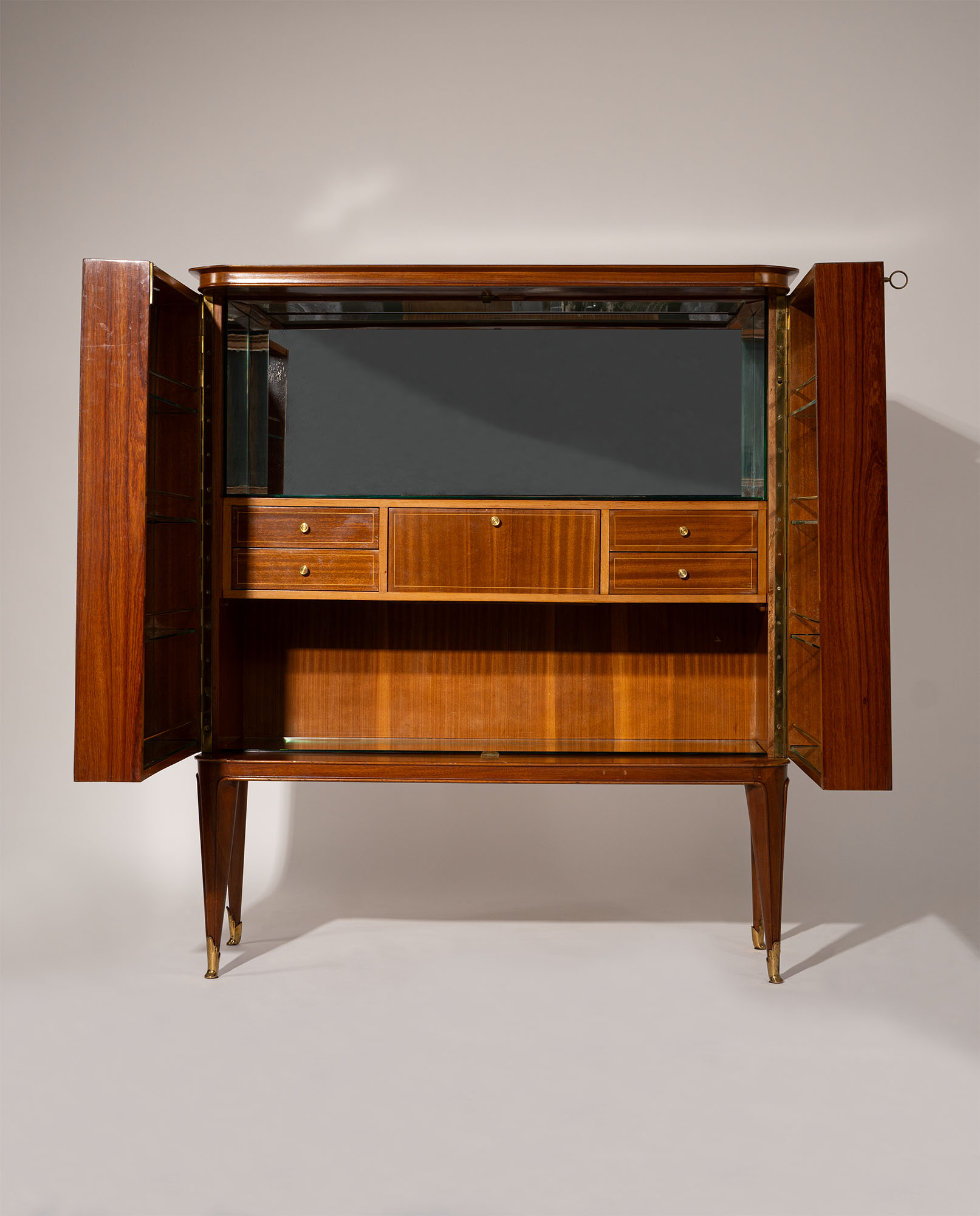 Inlaid woods of various types, Mirrored glass, Brass details and tips