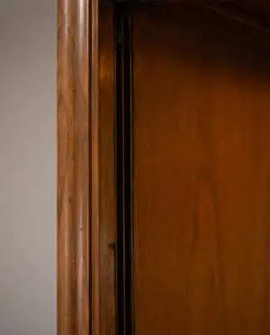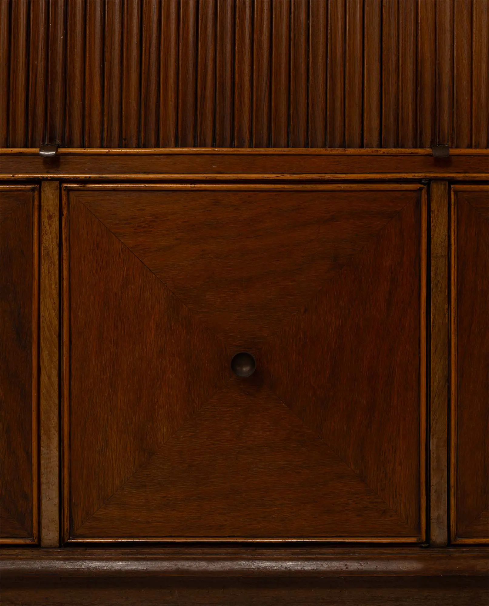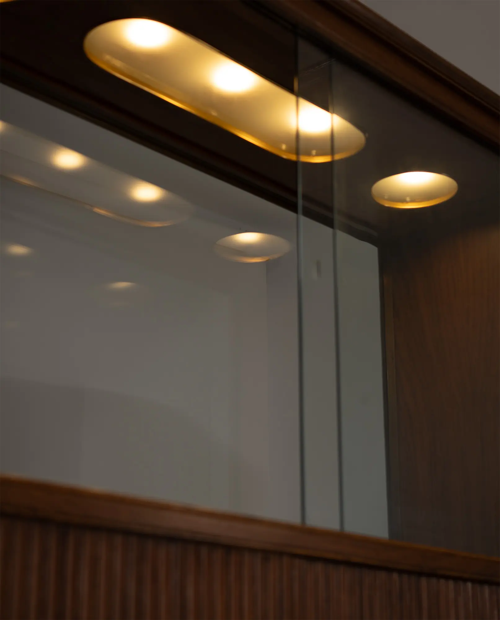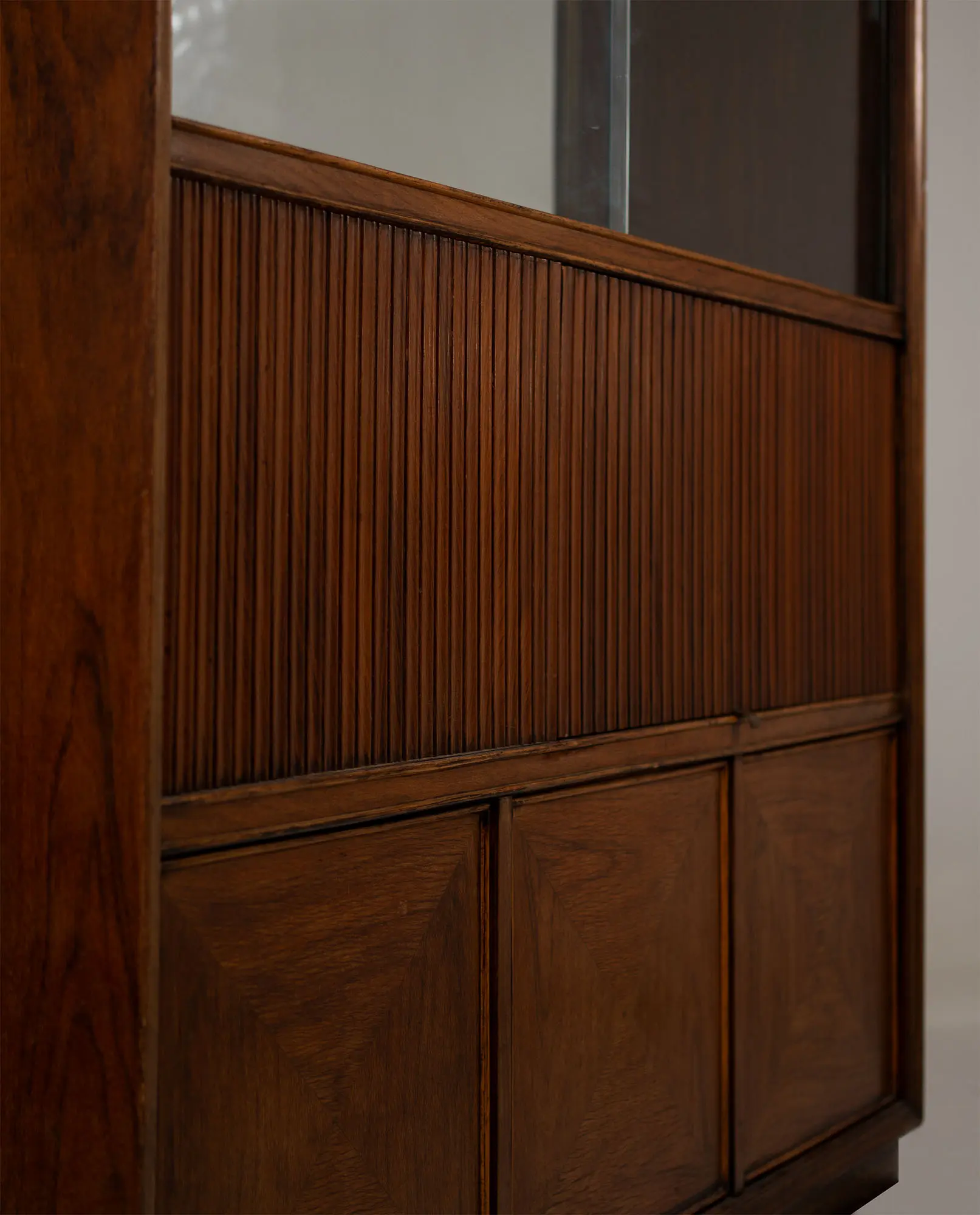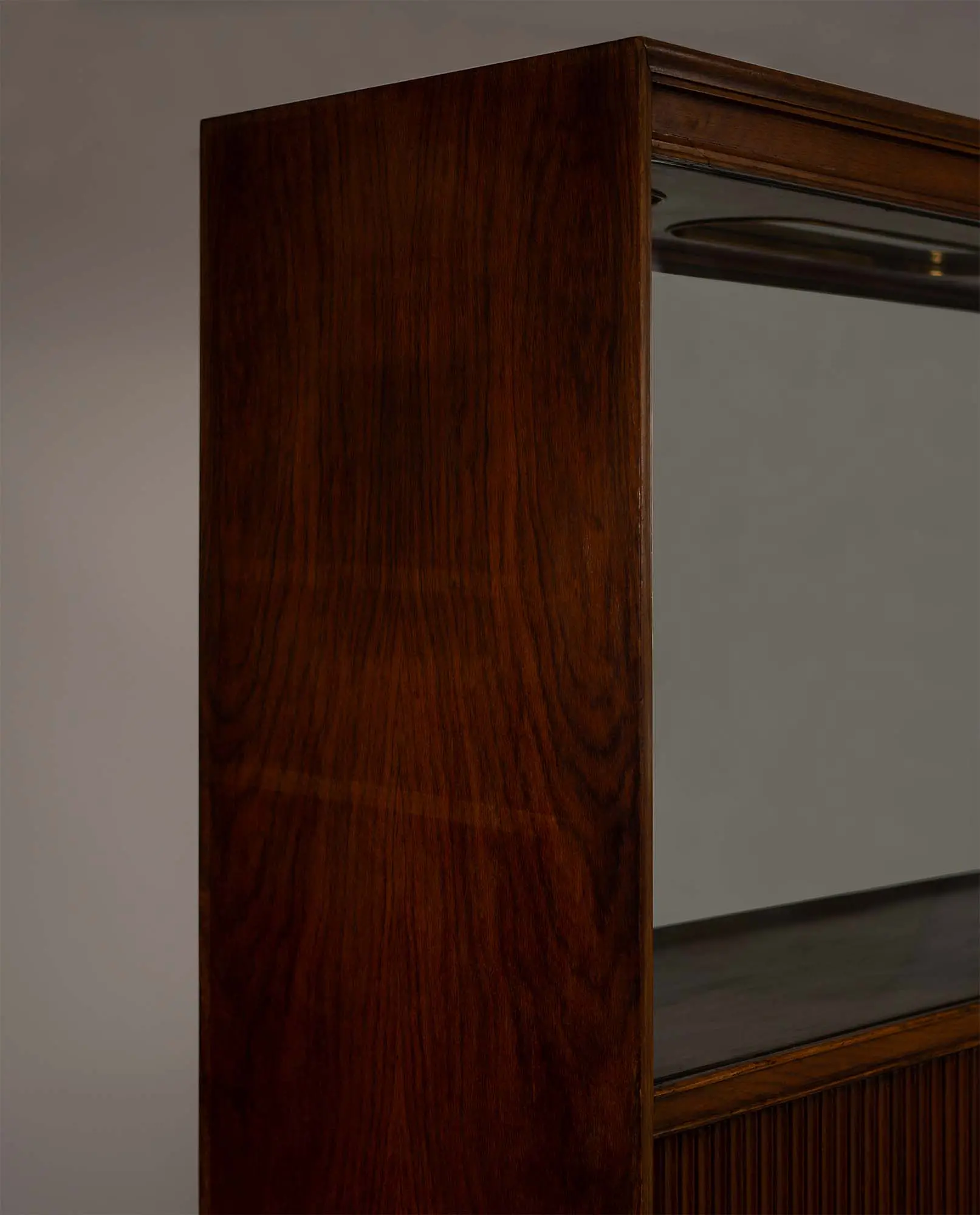 Italian double-sided cabinet, 1950. Crafted in wood with glass doors on both front and back vitrines. One side features an opening glass door, the other a fixed pane. The cabinet includes integrated lighting, uniting functionality with refined mid-century modern design. Its clean lines and elegant proportions embody the sophistication of Italian craftsmanship.