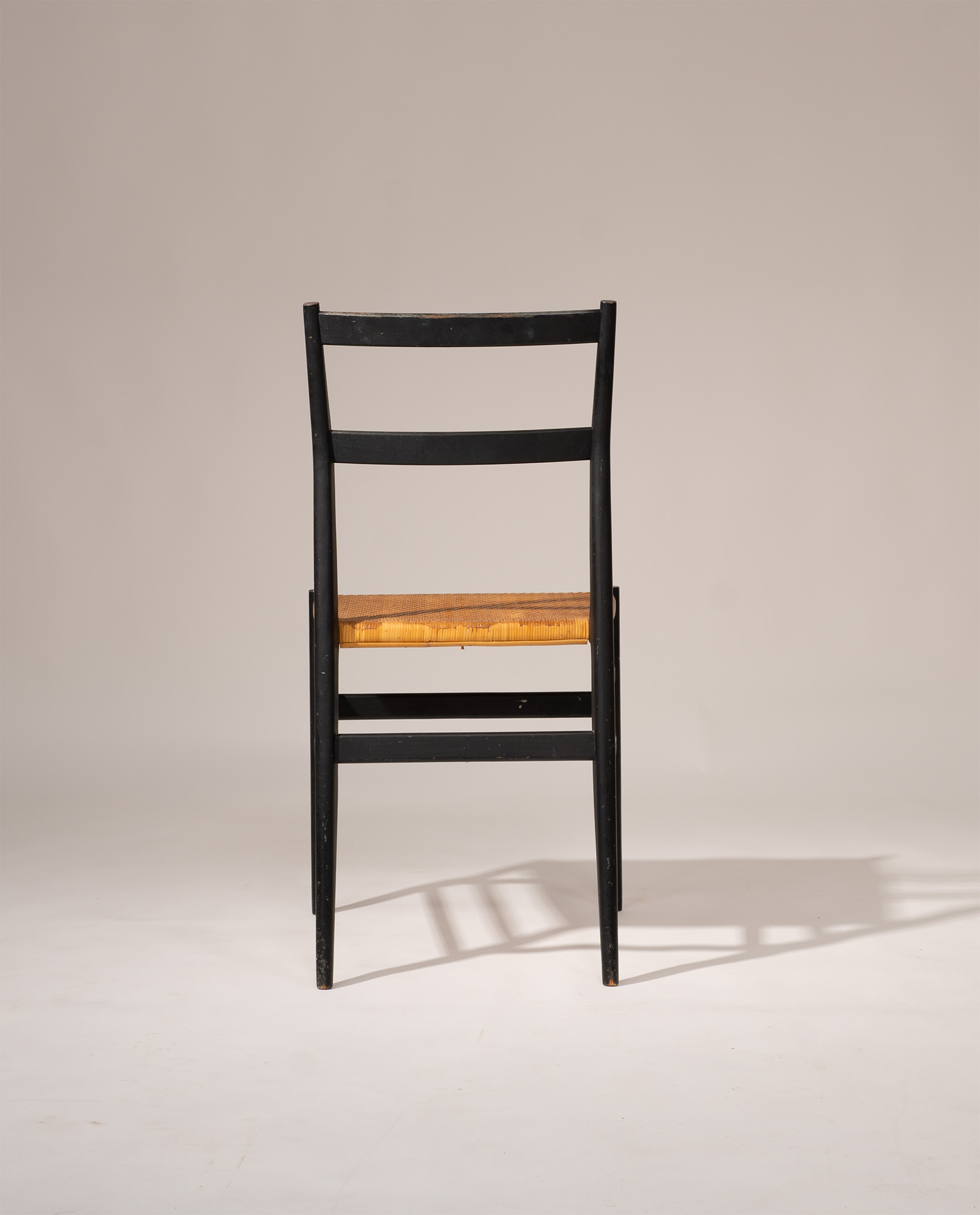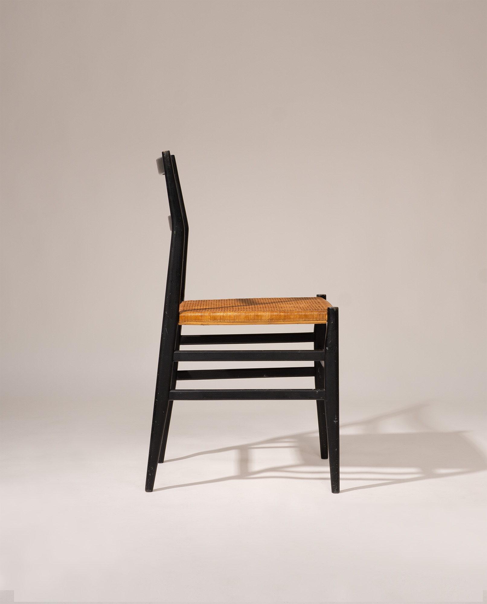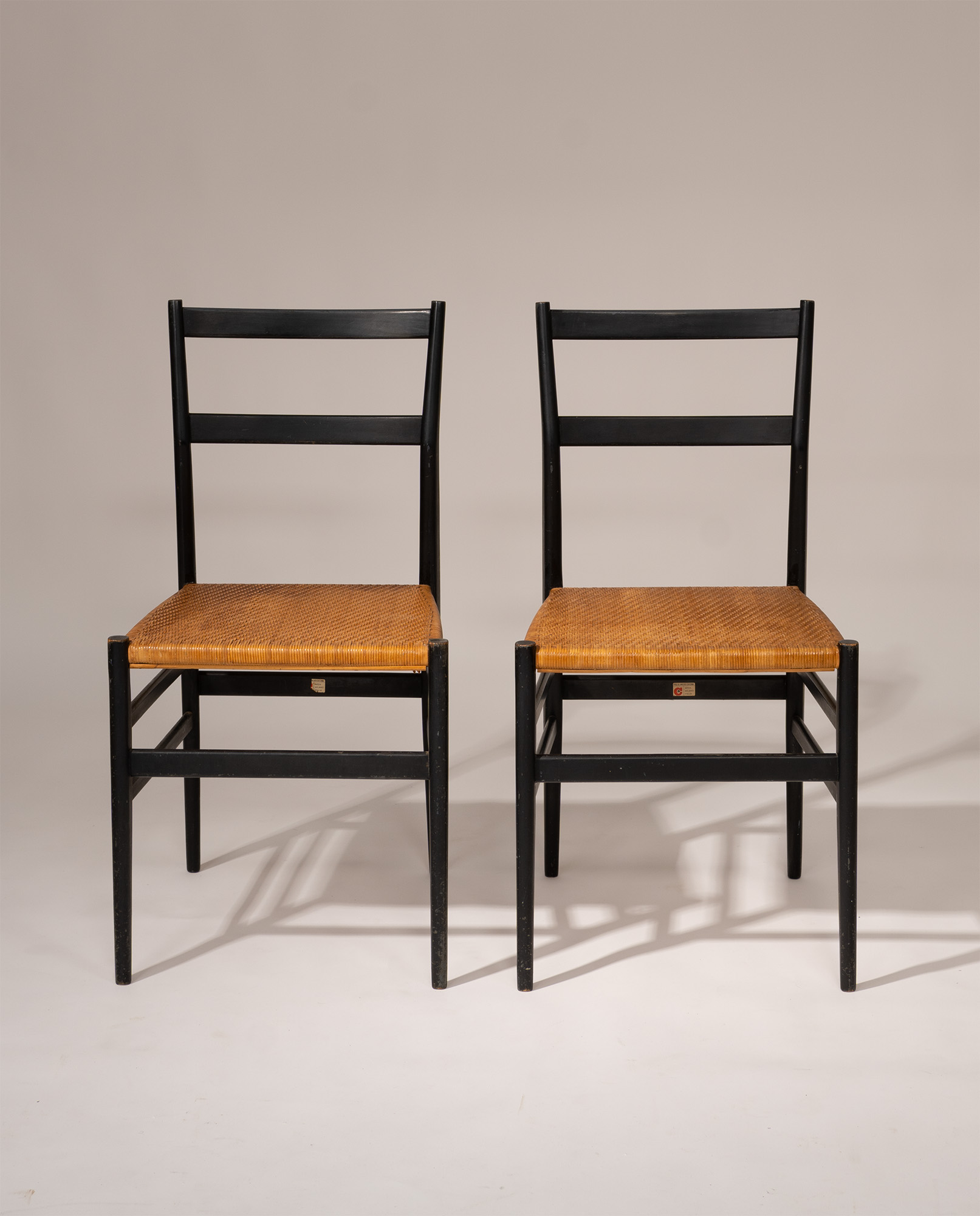 Set of 2 chairs designed by Gio Ponti for Cassina, Italy, 1957. Crafted from solid ash painted black with straw seating, showcasing Ponti’s elegant Italian modernist design.