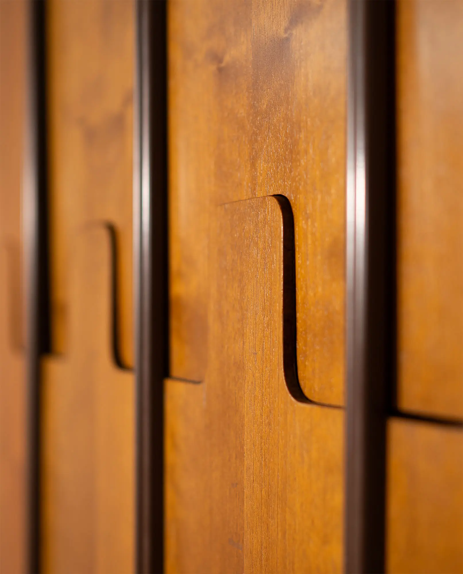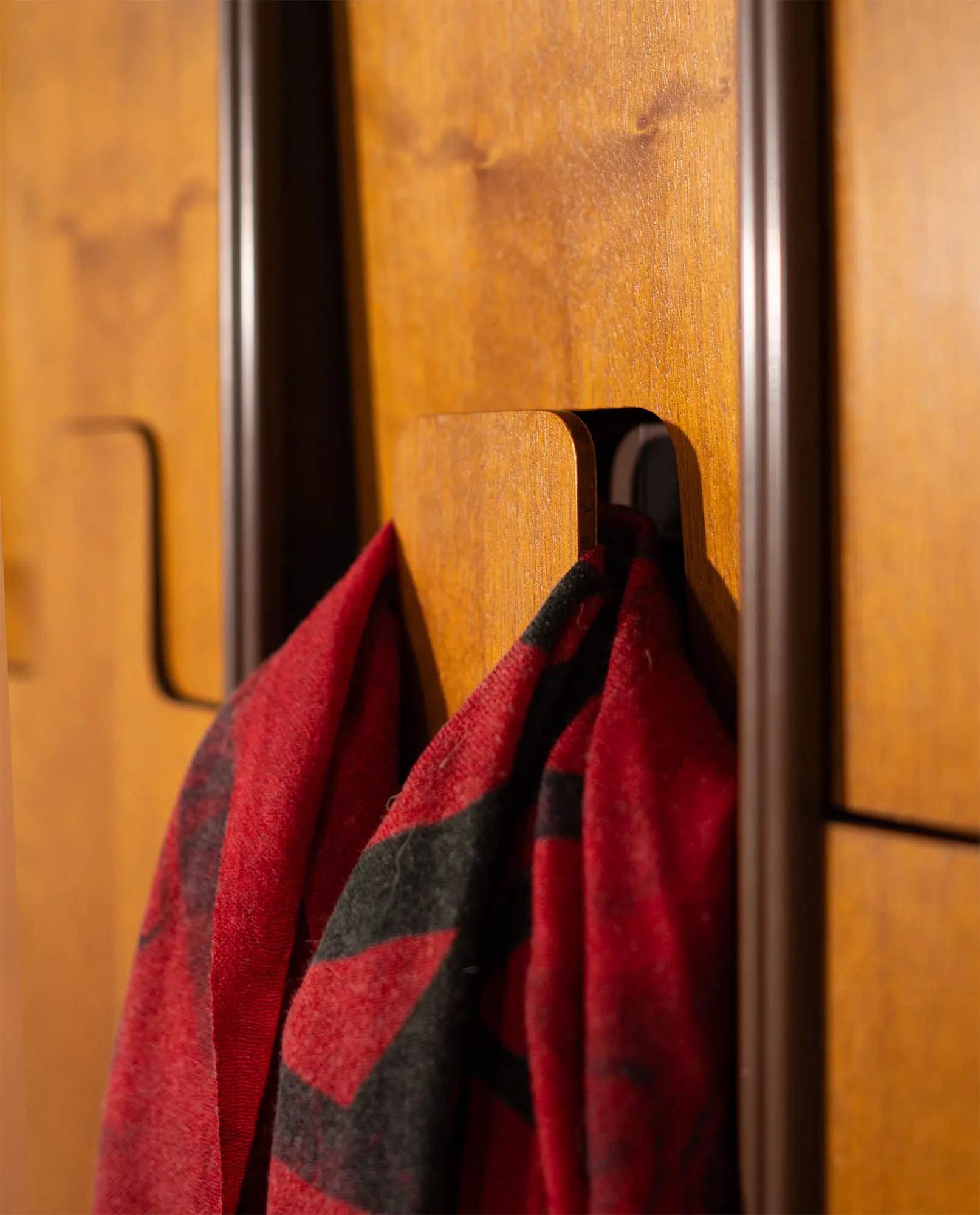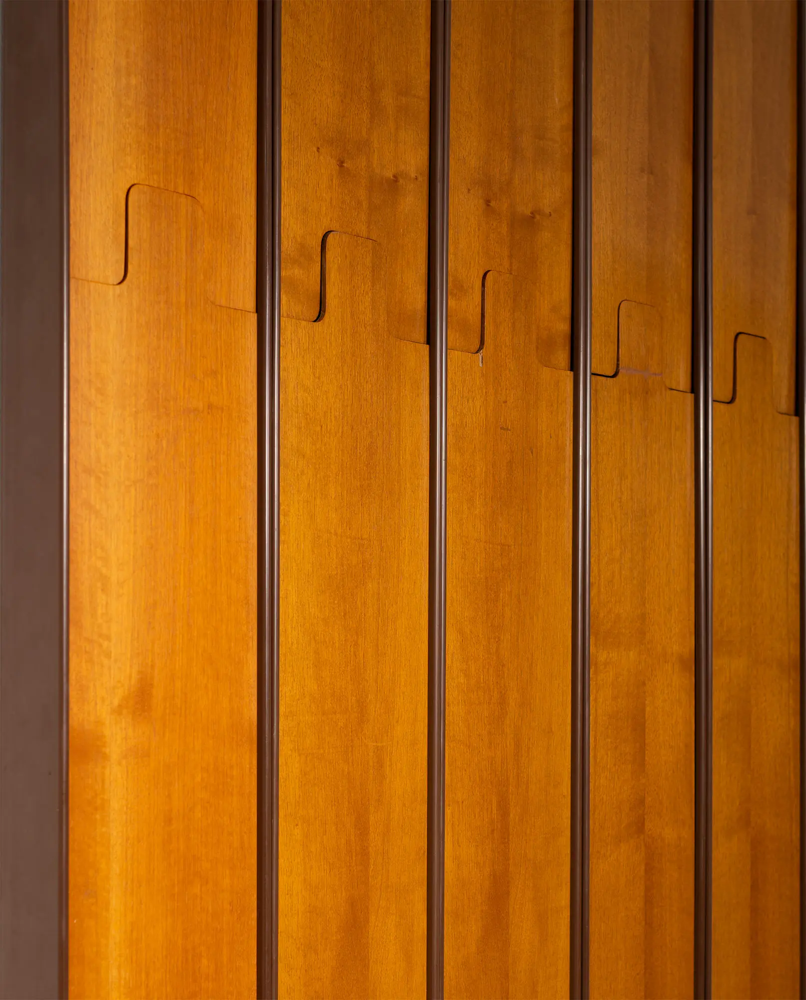 Composed of five modular elements, the coat hanger features walnut wood fronts with ABS resin backs. The upper section of each module is seamlessly integrated into the form and, when pressed inward, functions as a hook for hanging garments. This discreet push mechanism exemplifies Bertoncini’s rational and user-oriented approach, combining clean geometry, material contrast, and functional ingenuity. Hallmarks of Mid-Century Italian design.