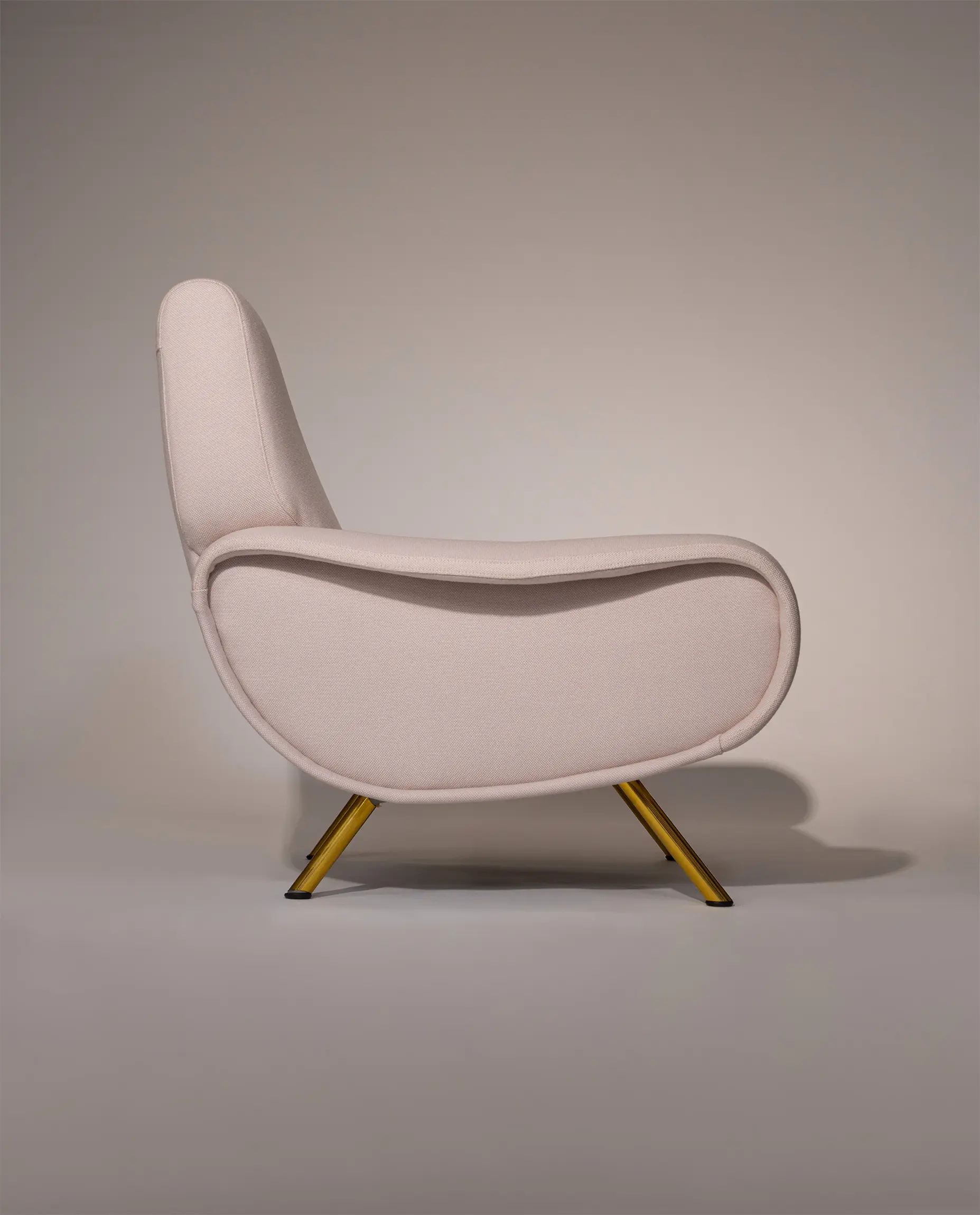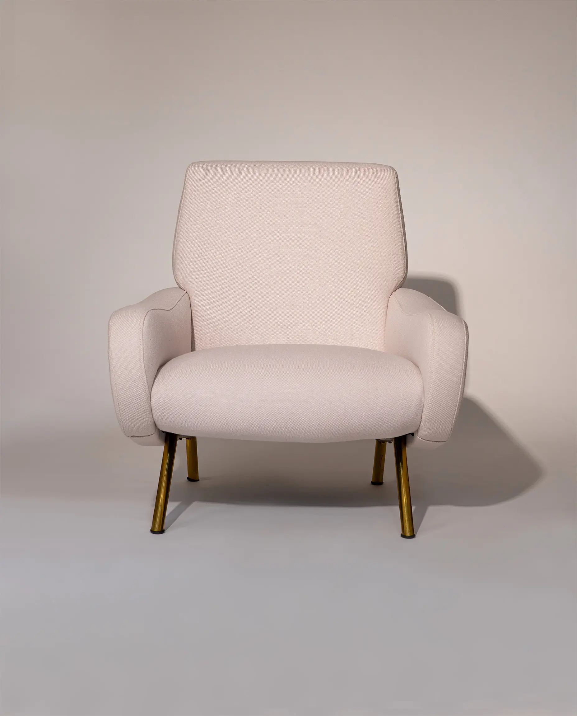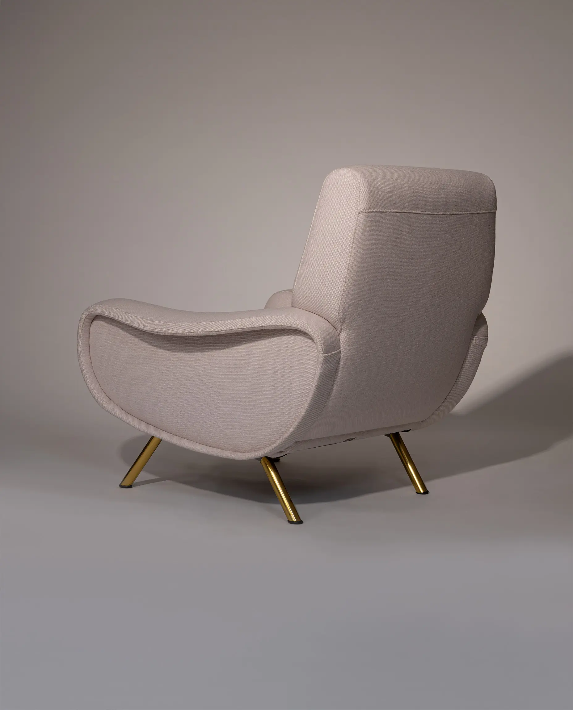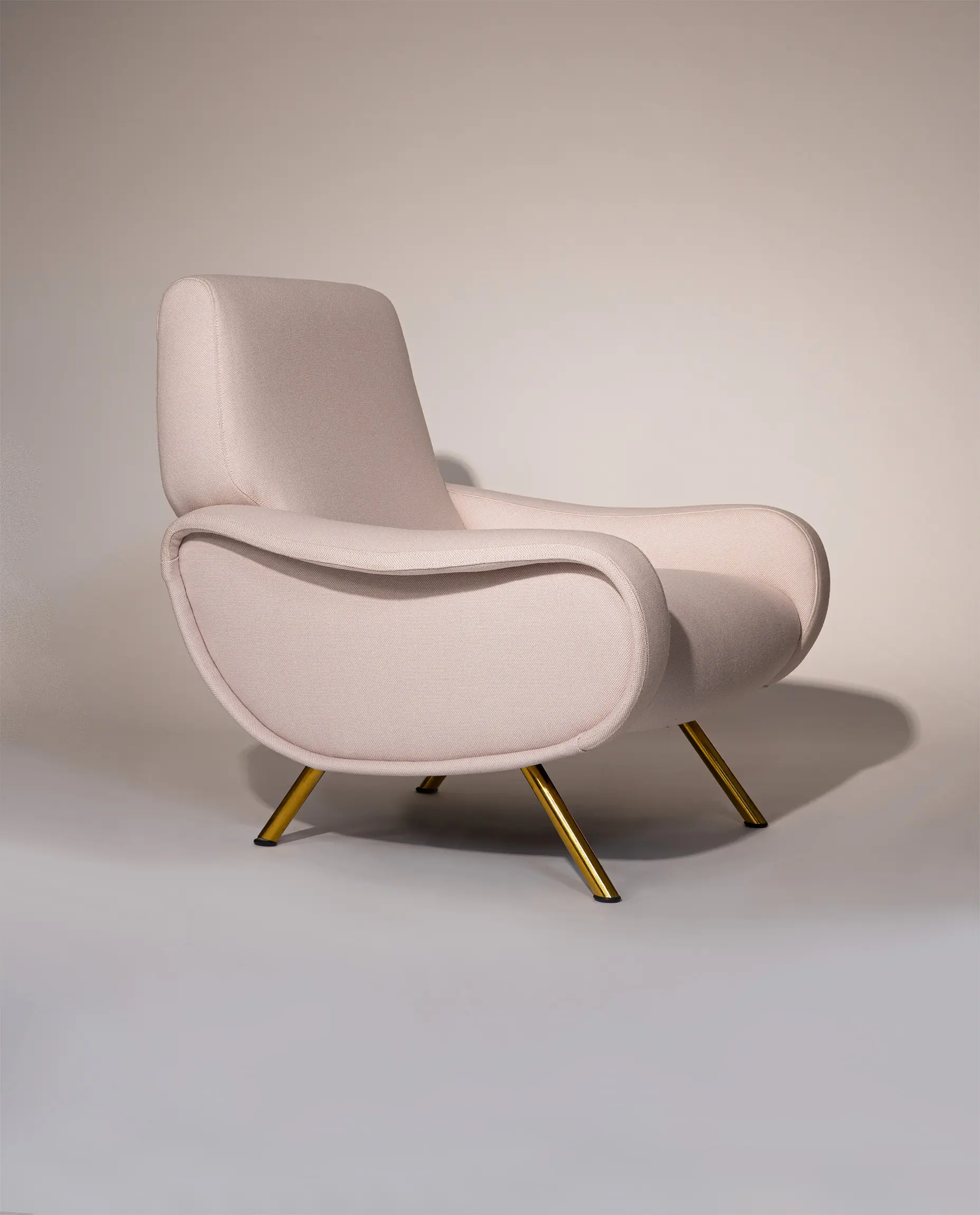 This elegant armchair features refined brass-plated legs and has been newly reupholstered in a soft white cream fabric by De Ploeg (Ploegwool 02), enhancing both its comfort and timeless appeal. Renowned for its sculptural form and exceptional seating comfort, the Lady Chair is a defining piece of mid-century Italian design.