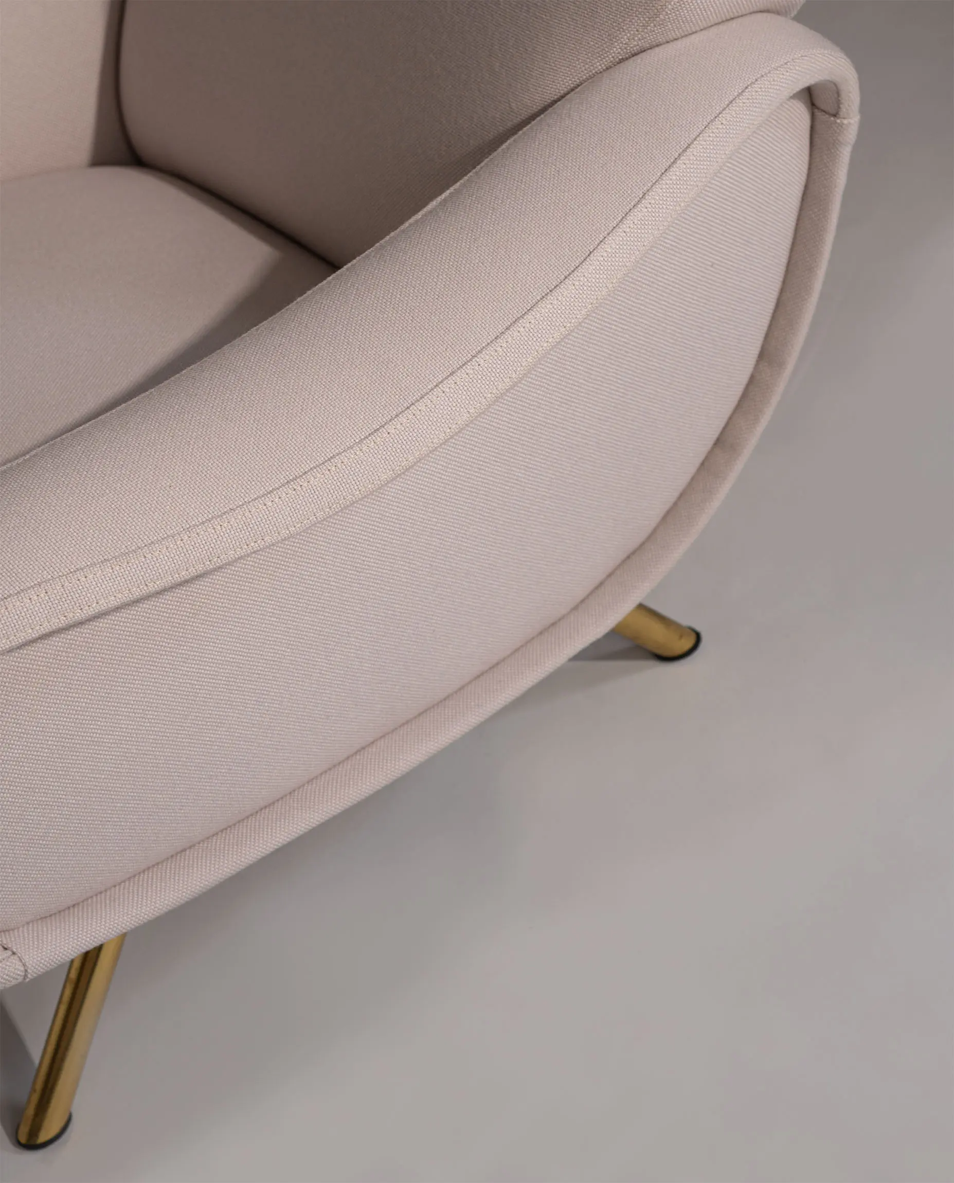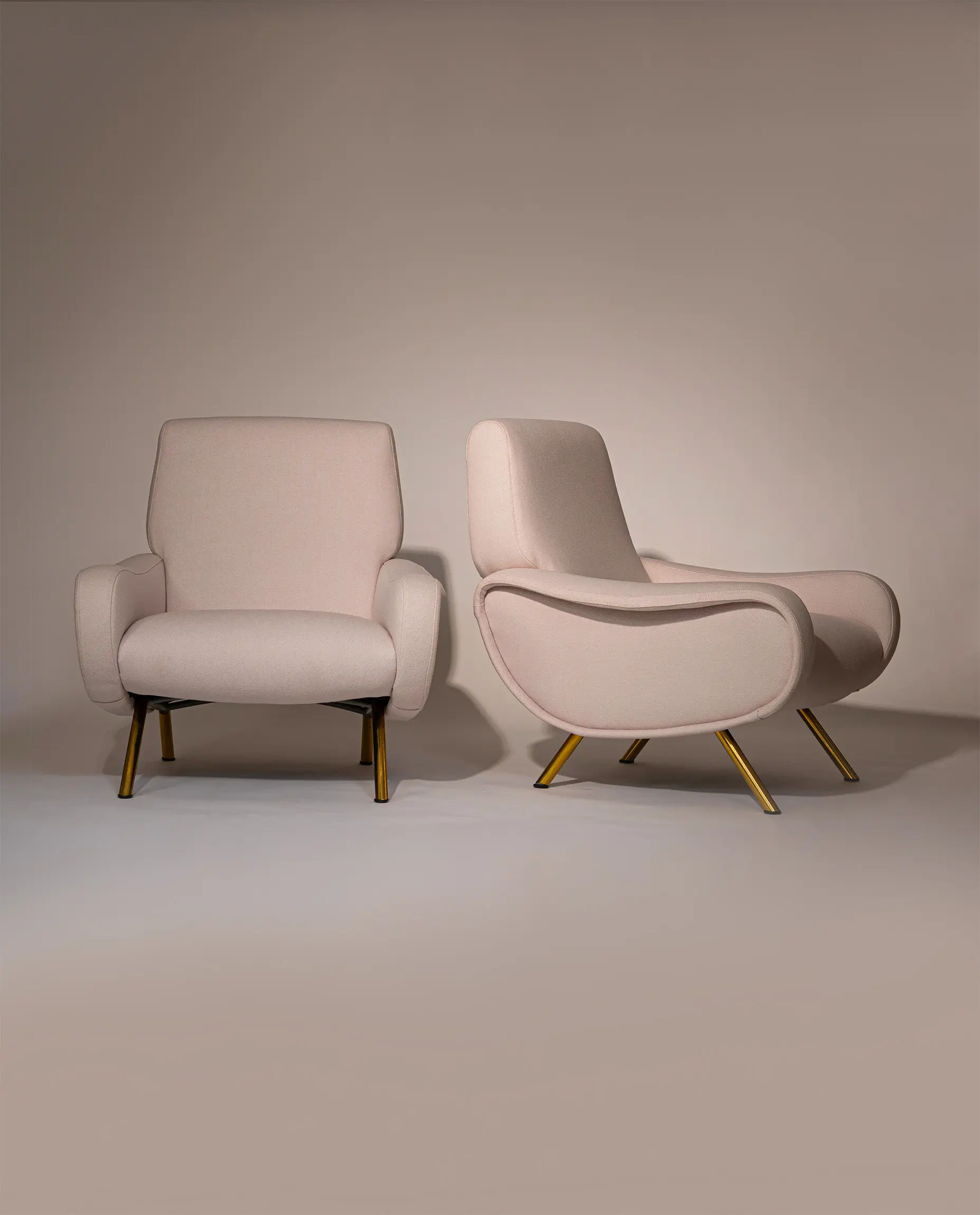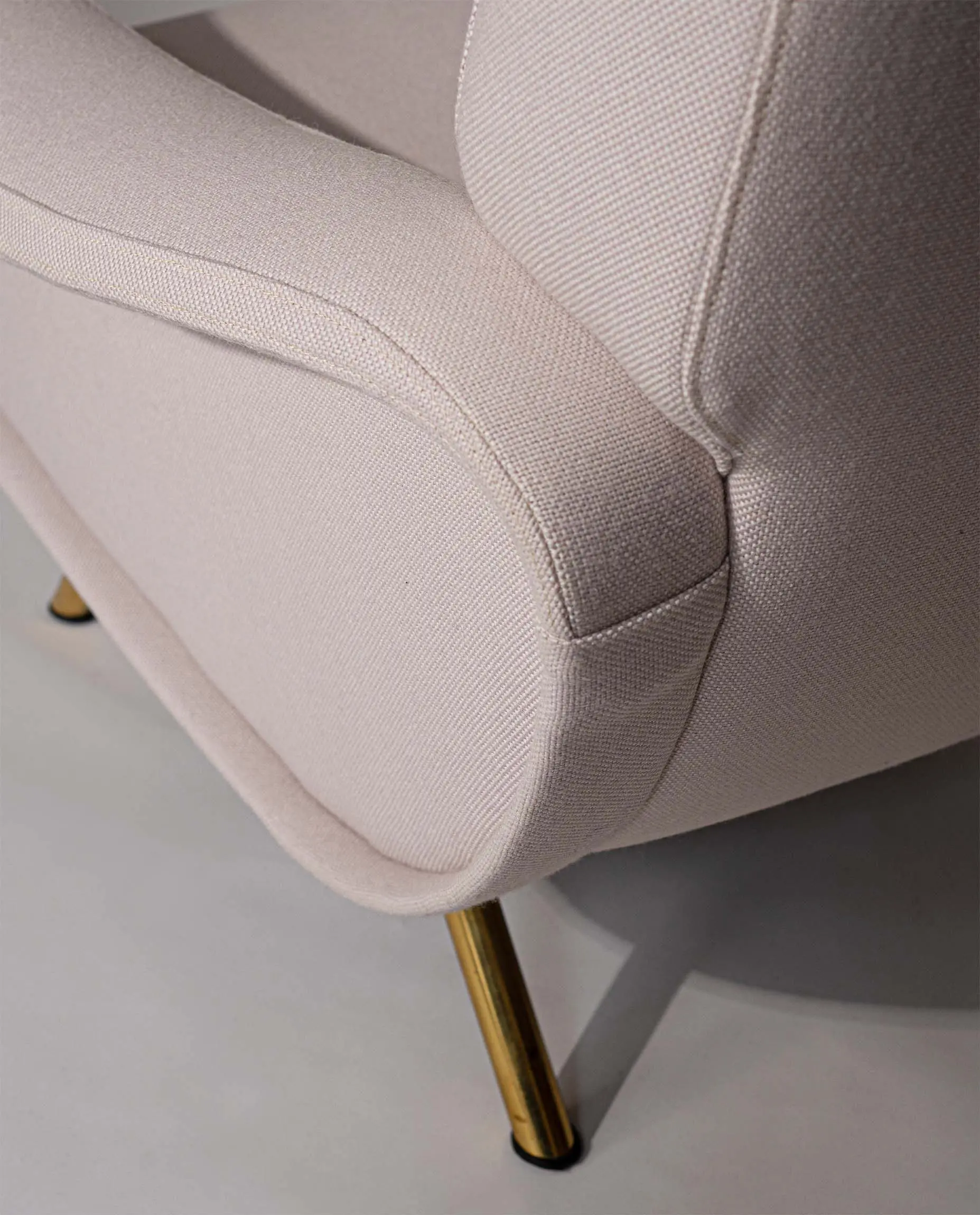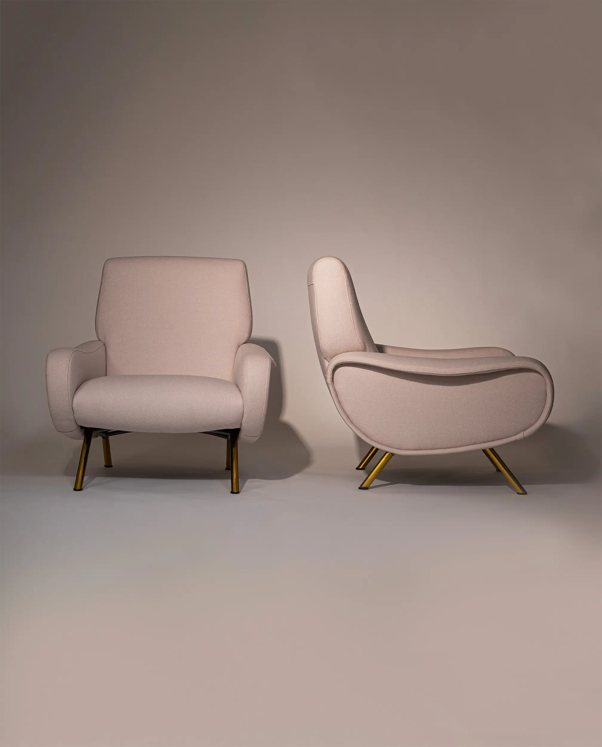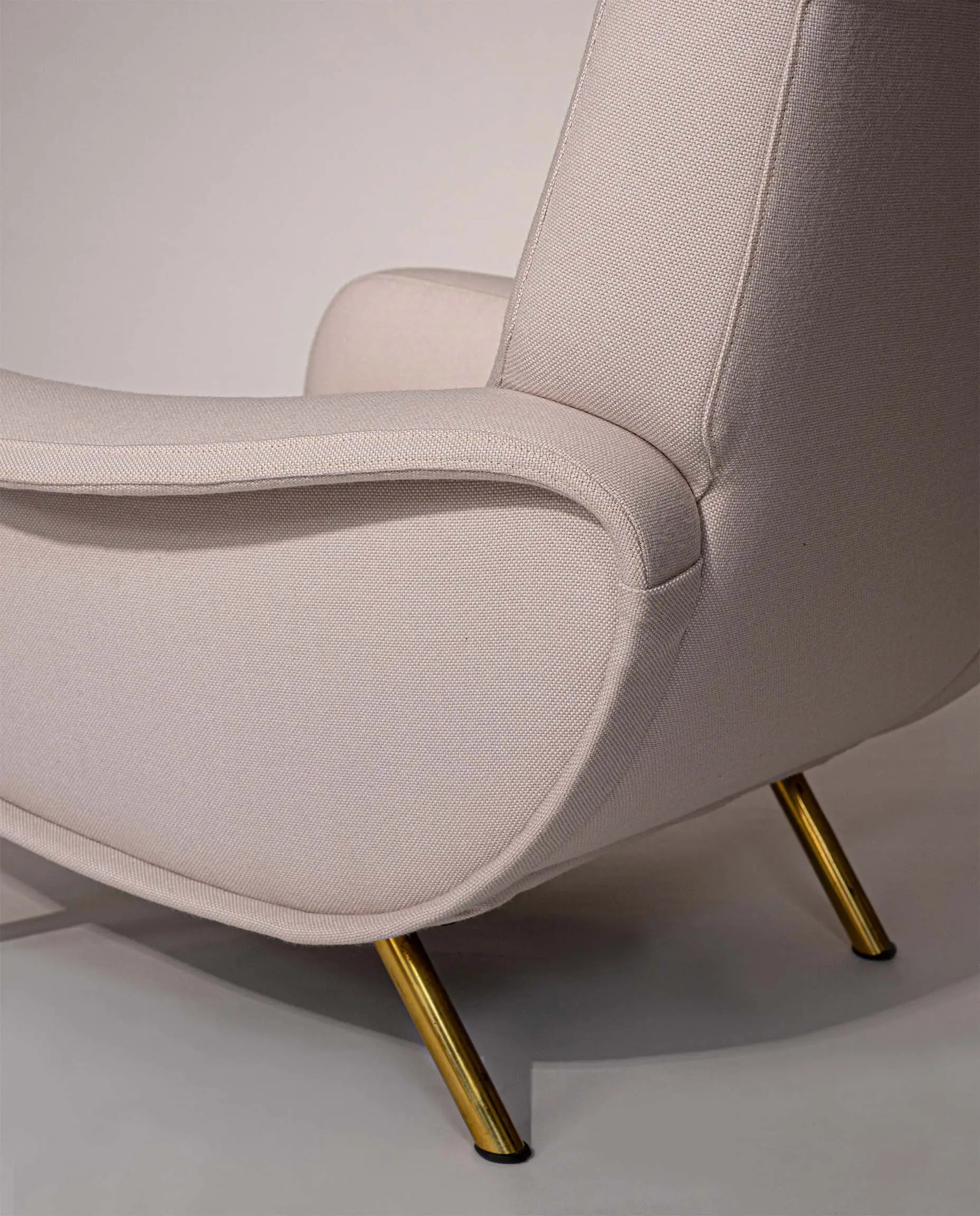 This elegant armchair features refined brass-plated legs and has been newly reupholstered in a soft white cream fabric by De Ploeg (Ploegwool 02), enhancing both its comfort and timeless appeal. Renowned for its sculptural form and exceptional seating comfort, the Lady Chair is a defining piece of mid-century Italian design.