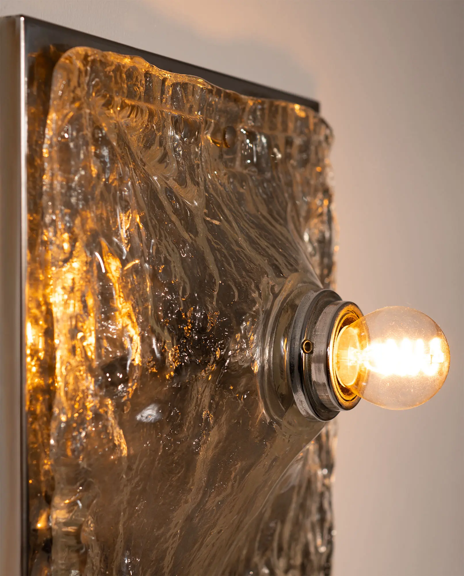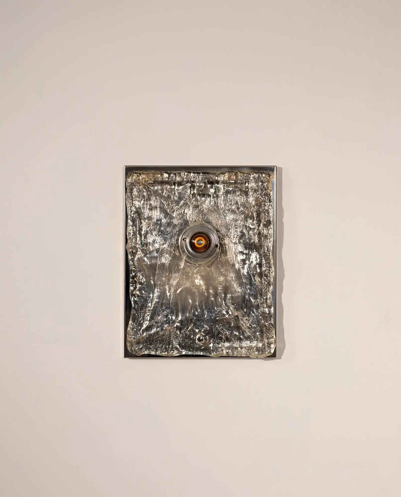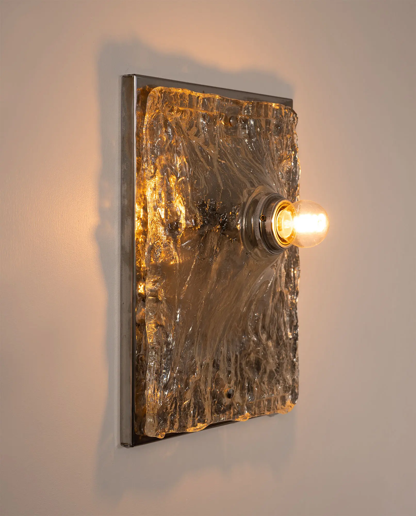 1970s wall lamp made of chromed steel with a textured Murano plate glass panel. The sculptural glass softly diffuses the light, creating a warm glow and highlighting the depth and character of the material. A clean, modern design with rich character.