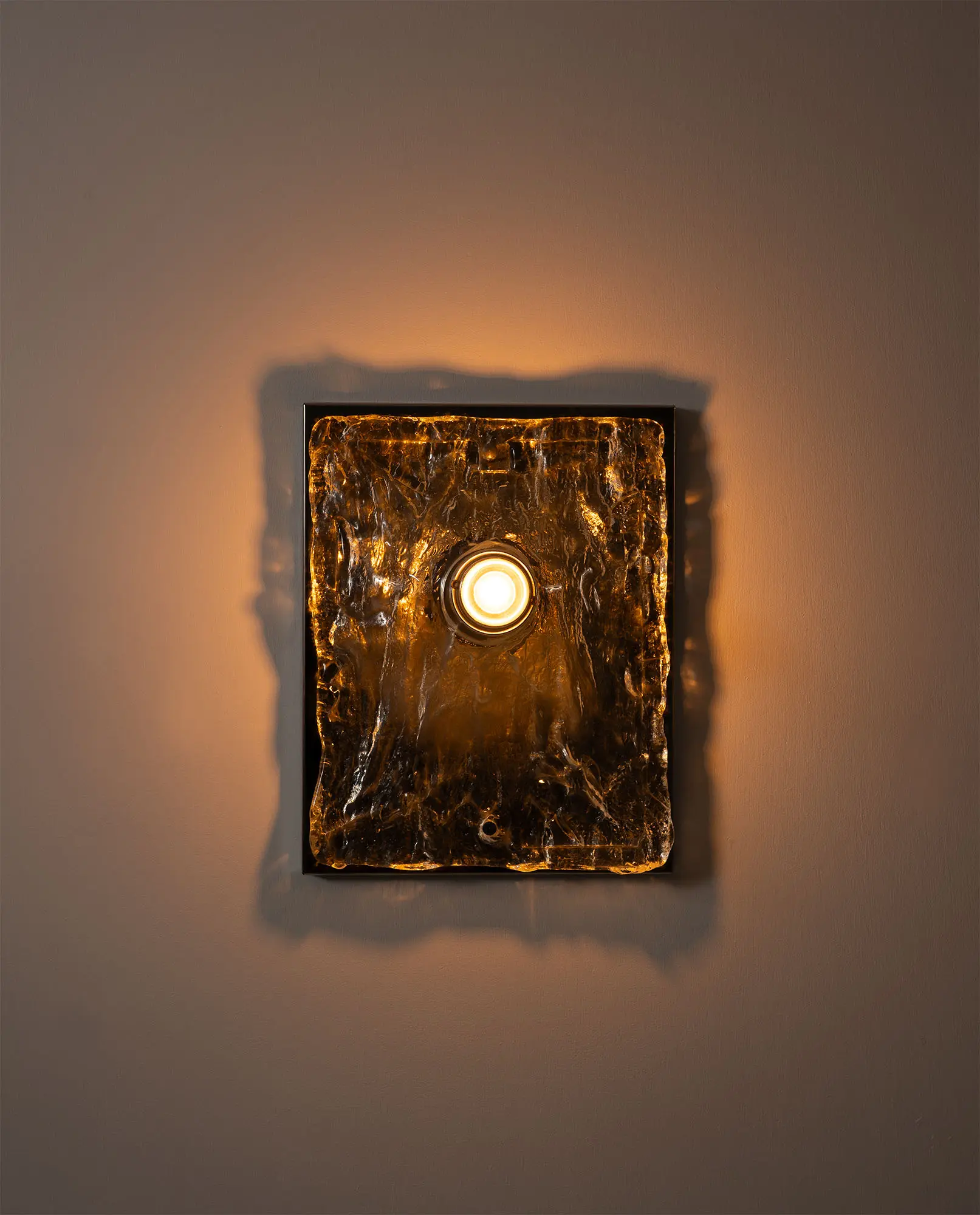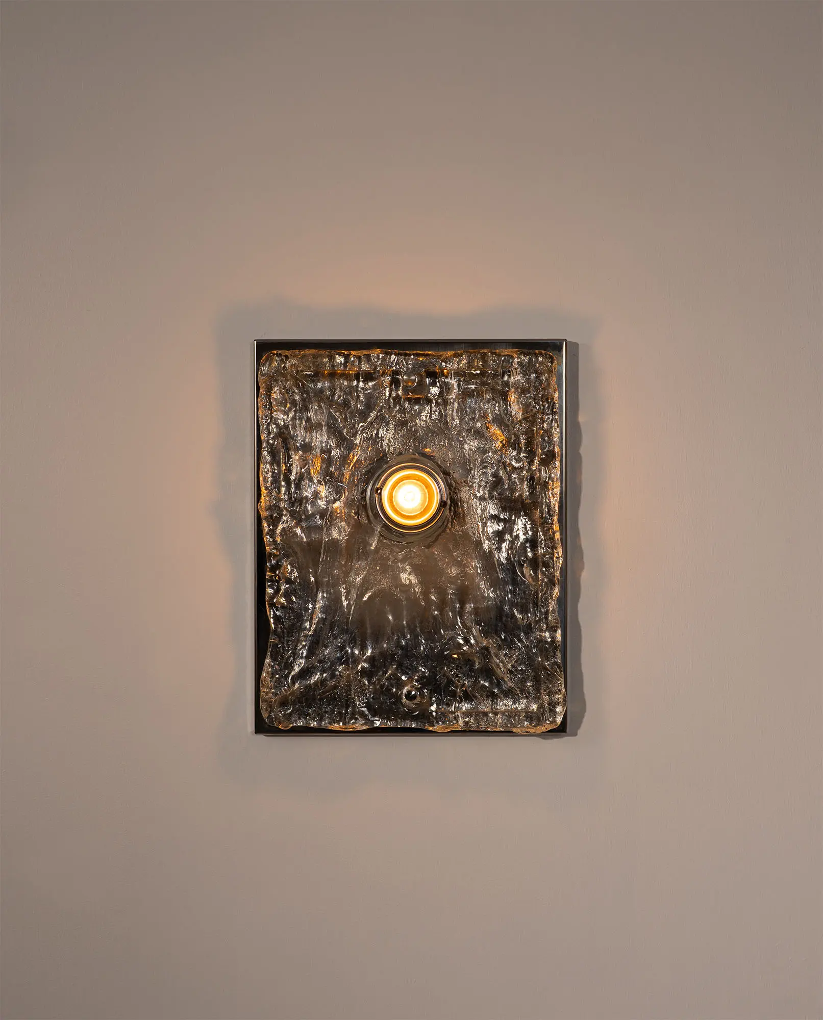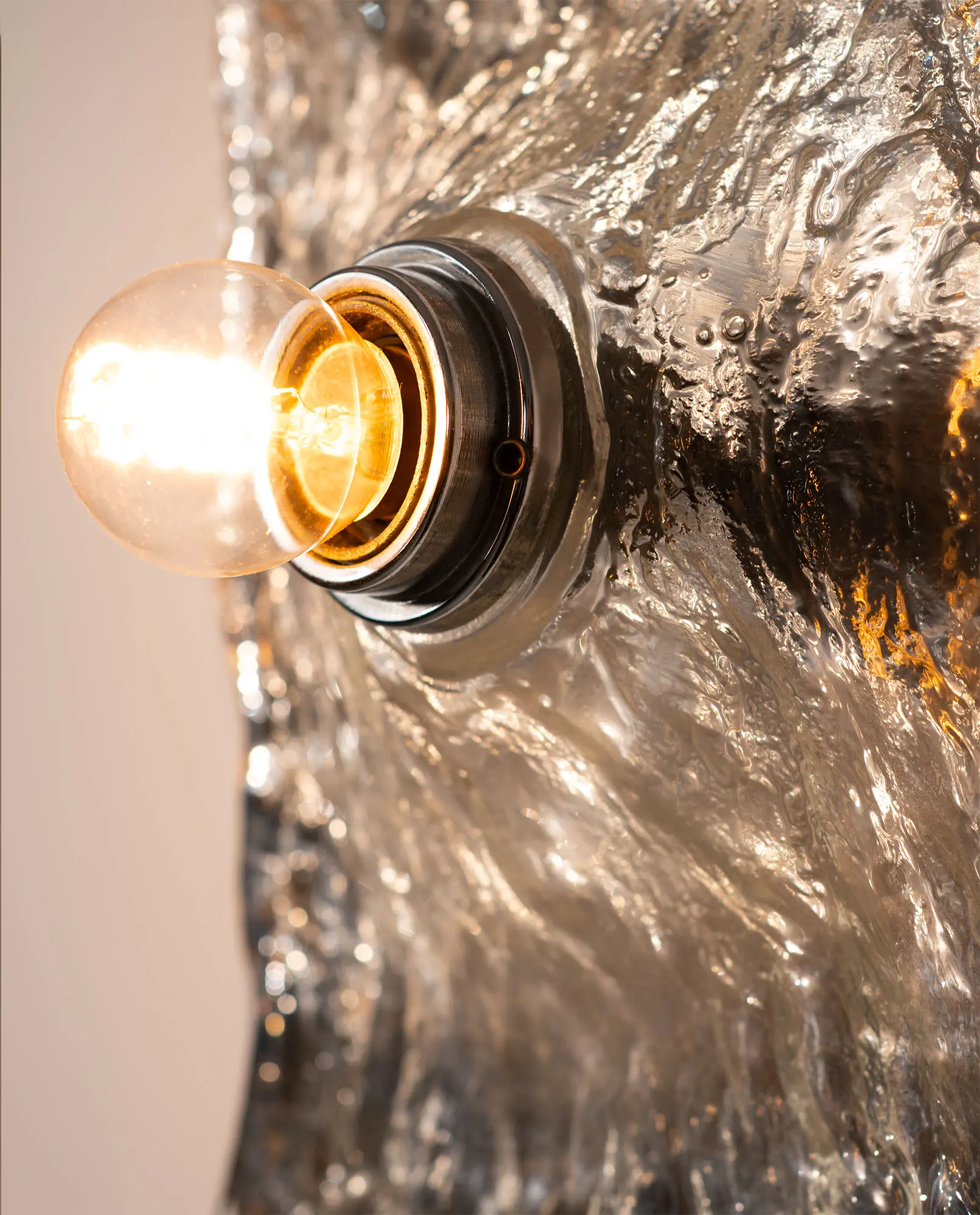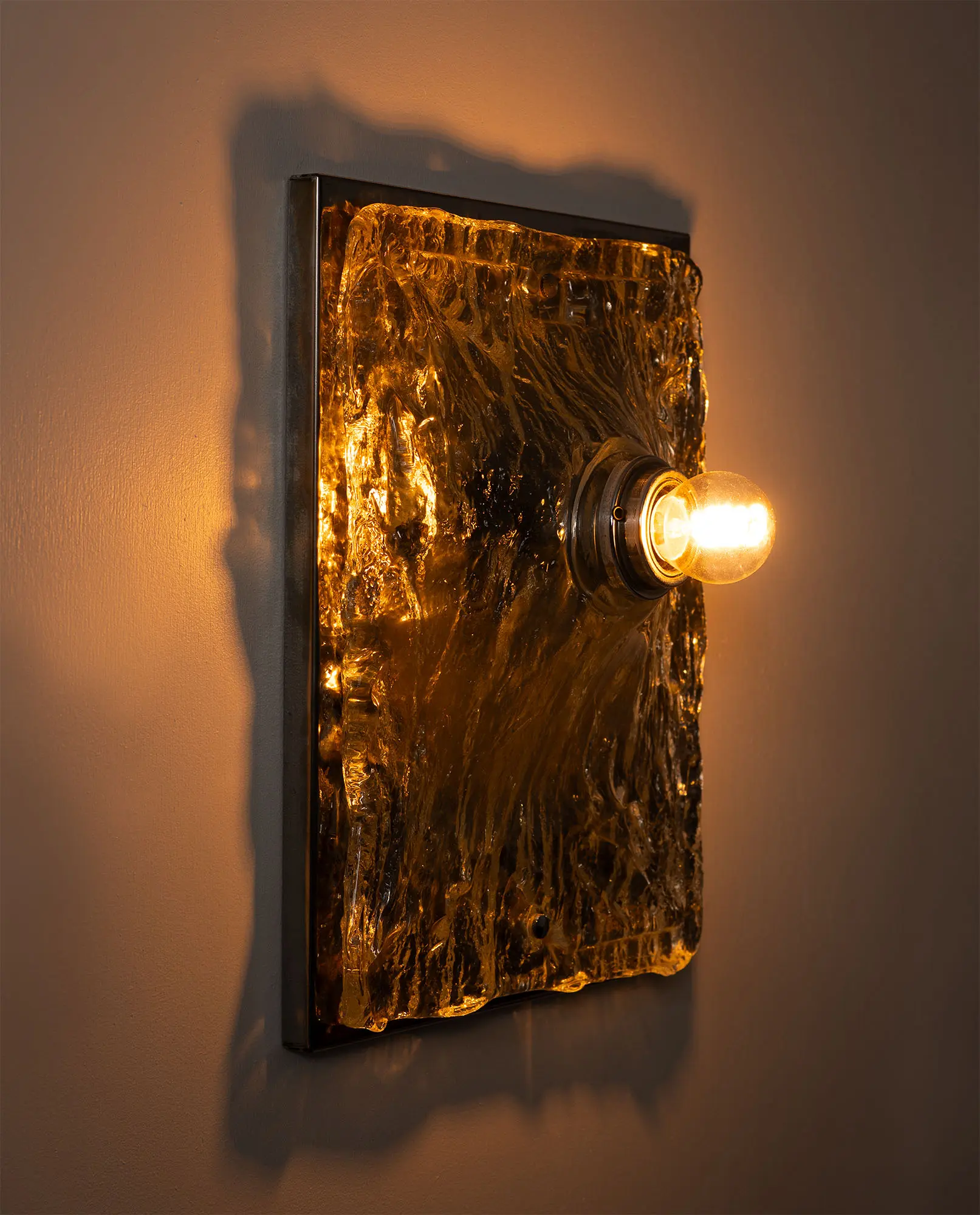1970s wall lamp made of chromed steel with a textured Murano plate glass panel. The sculptural glass softly diffuses the light, creating a warm glow and highlighting the depth and character of the material. A clean, modern design with rich character.
