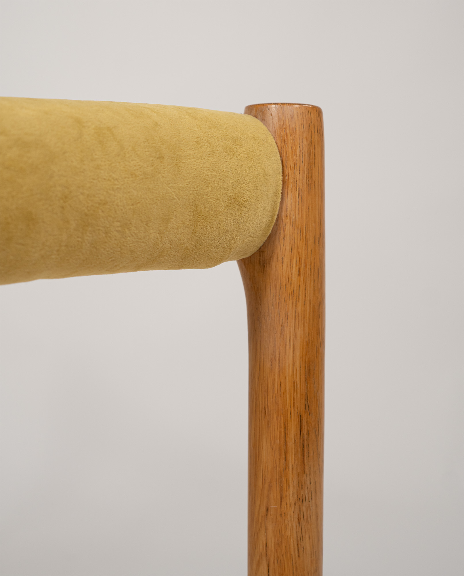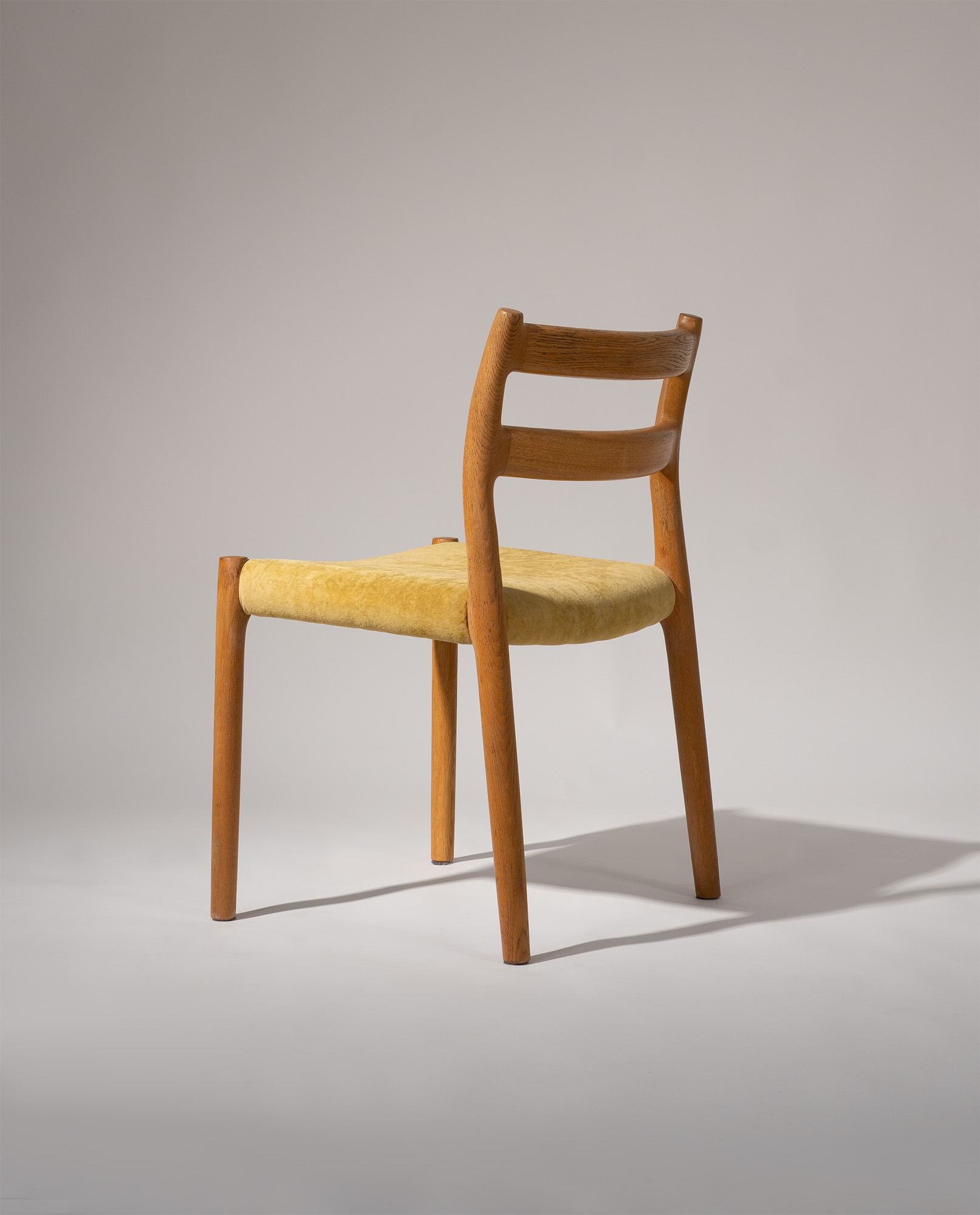 Danish mid-century dining chairs, Model 84, designed by Niels O. Møller for J.L. Møller in 1976. Crafted from solid teak wood with their original yellow velvet fabric, they exemplify classic Scandinavian craftsmanship and mid-century elegance.