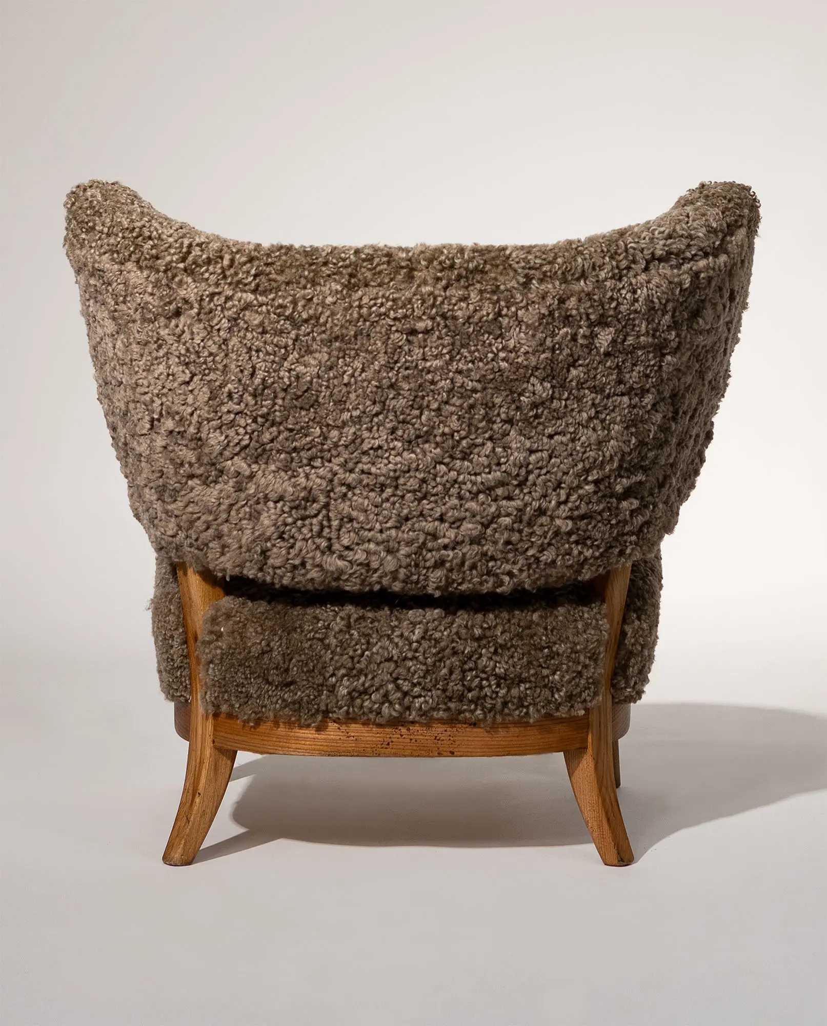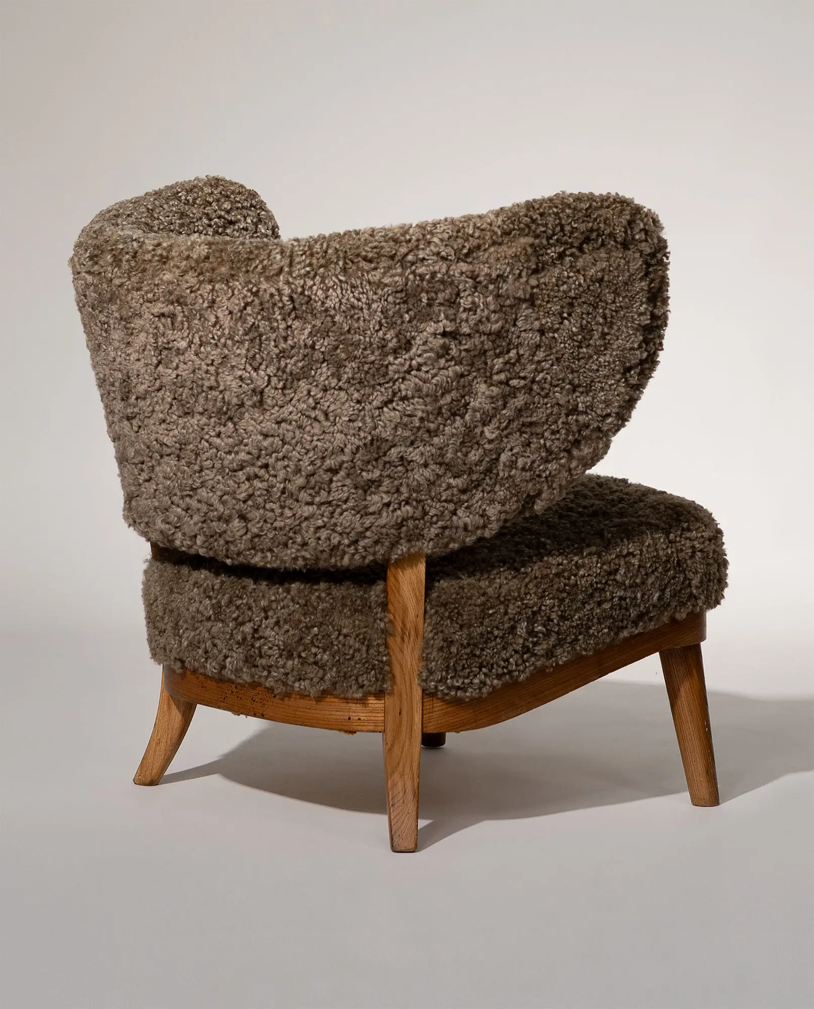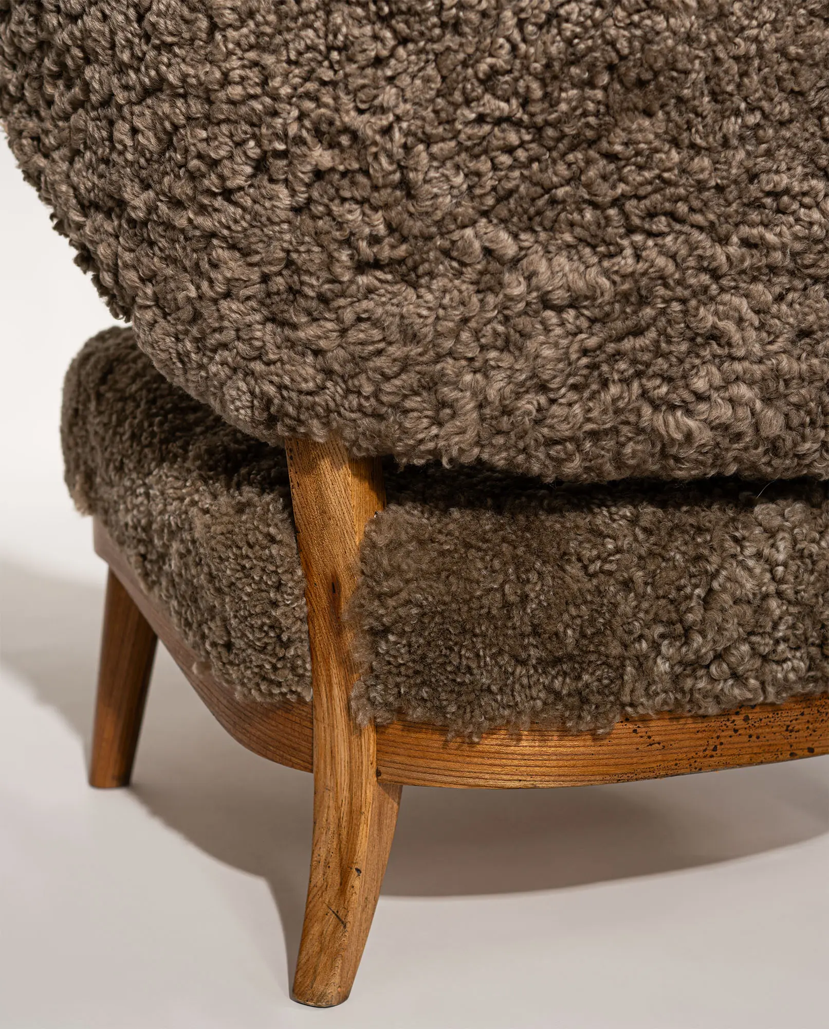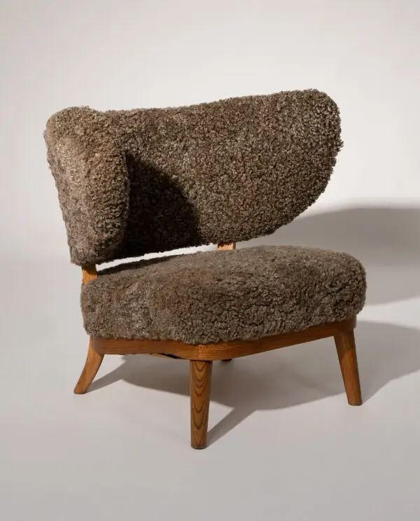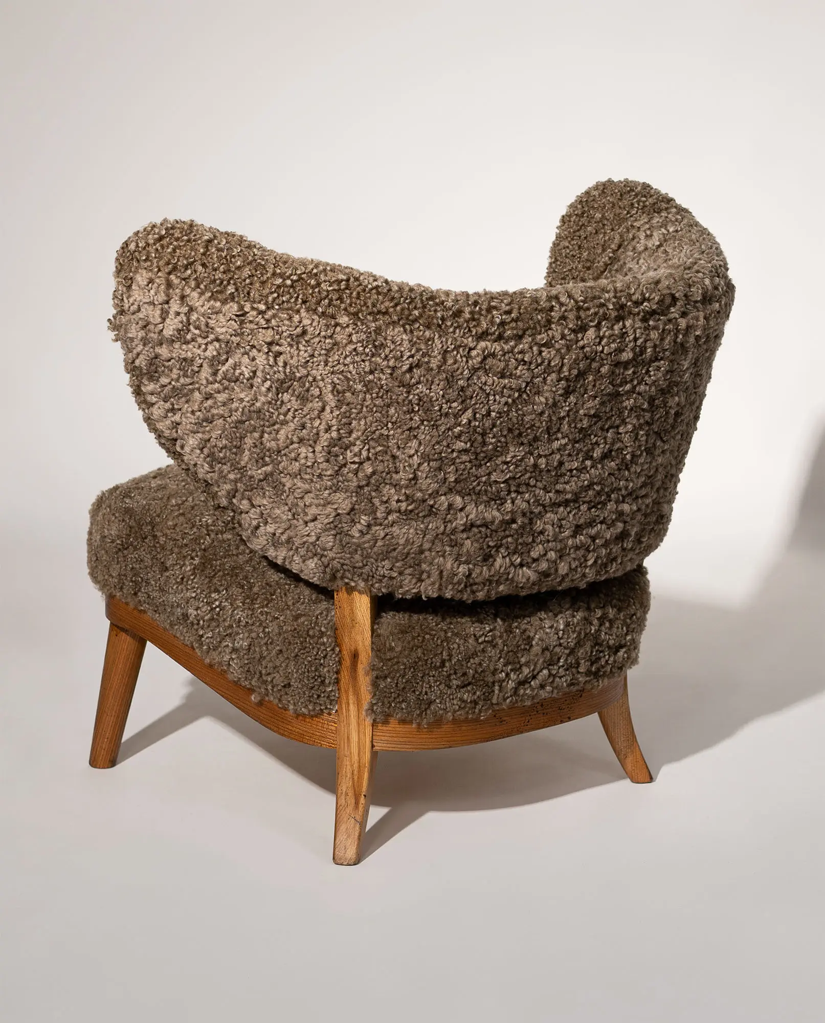 Upholstered in textured sheepskin, the organic volume contrasts beautifully with the exposed wooden frame and tapered legs. A sophisticated balance of structure and warmth, this armchair represents an exceptional example of early Scandinavian modernism.