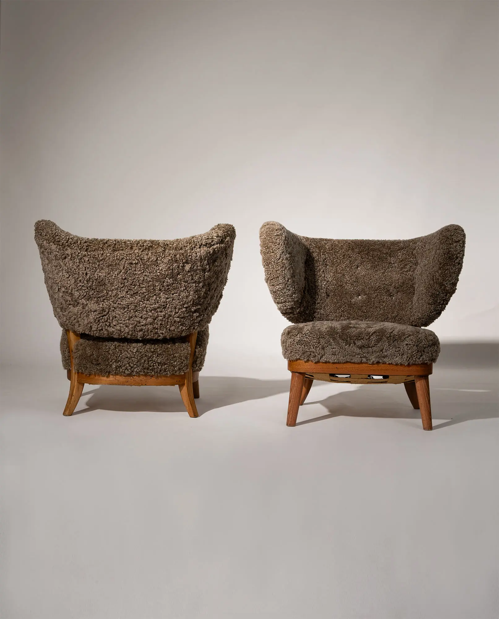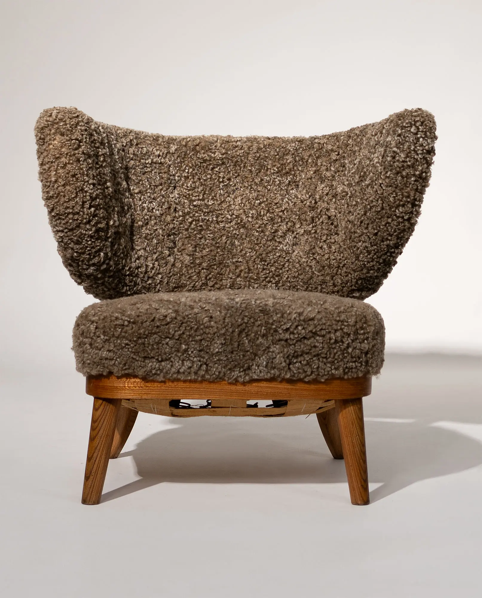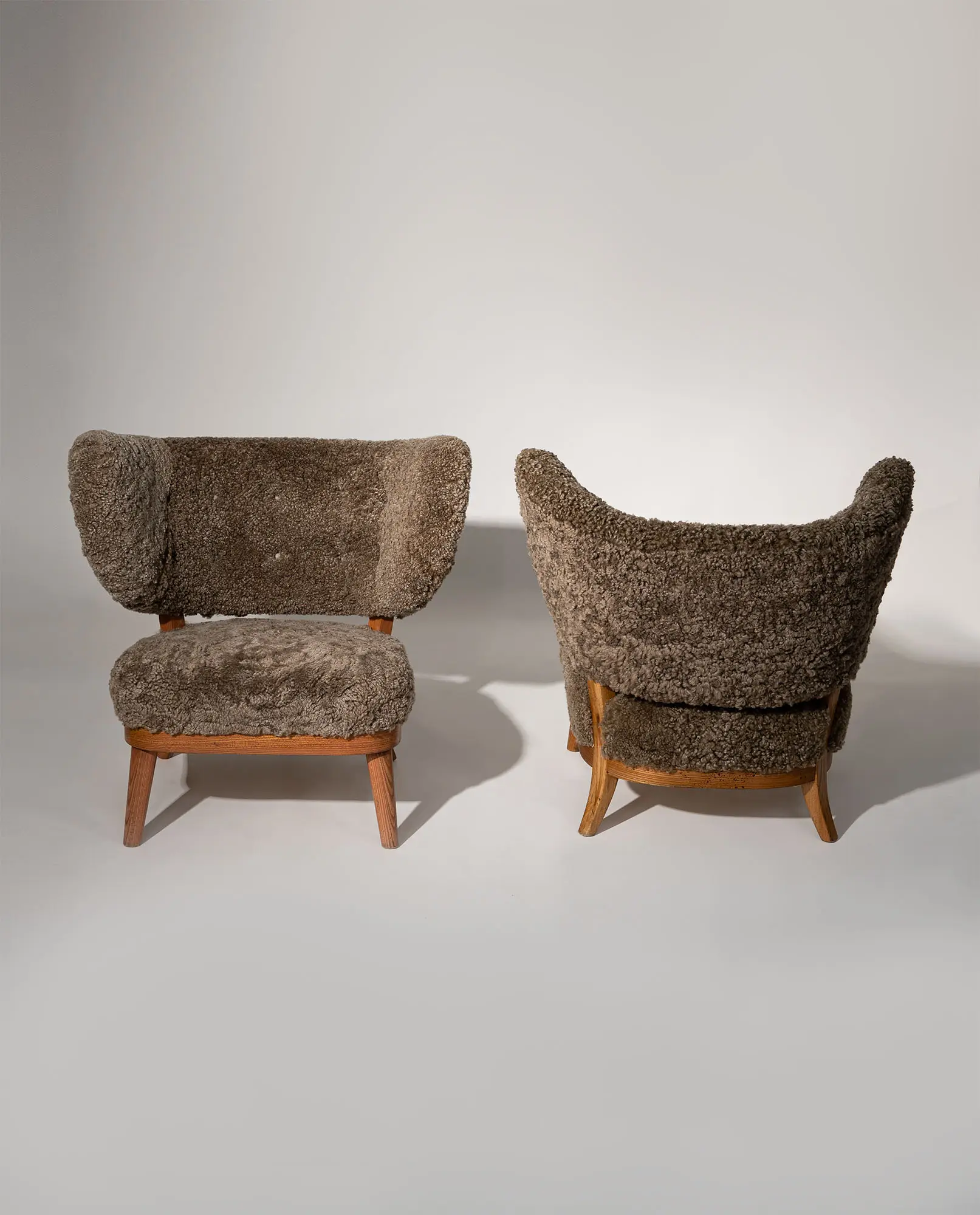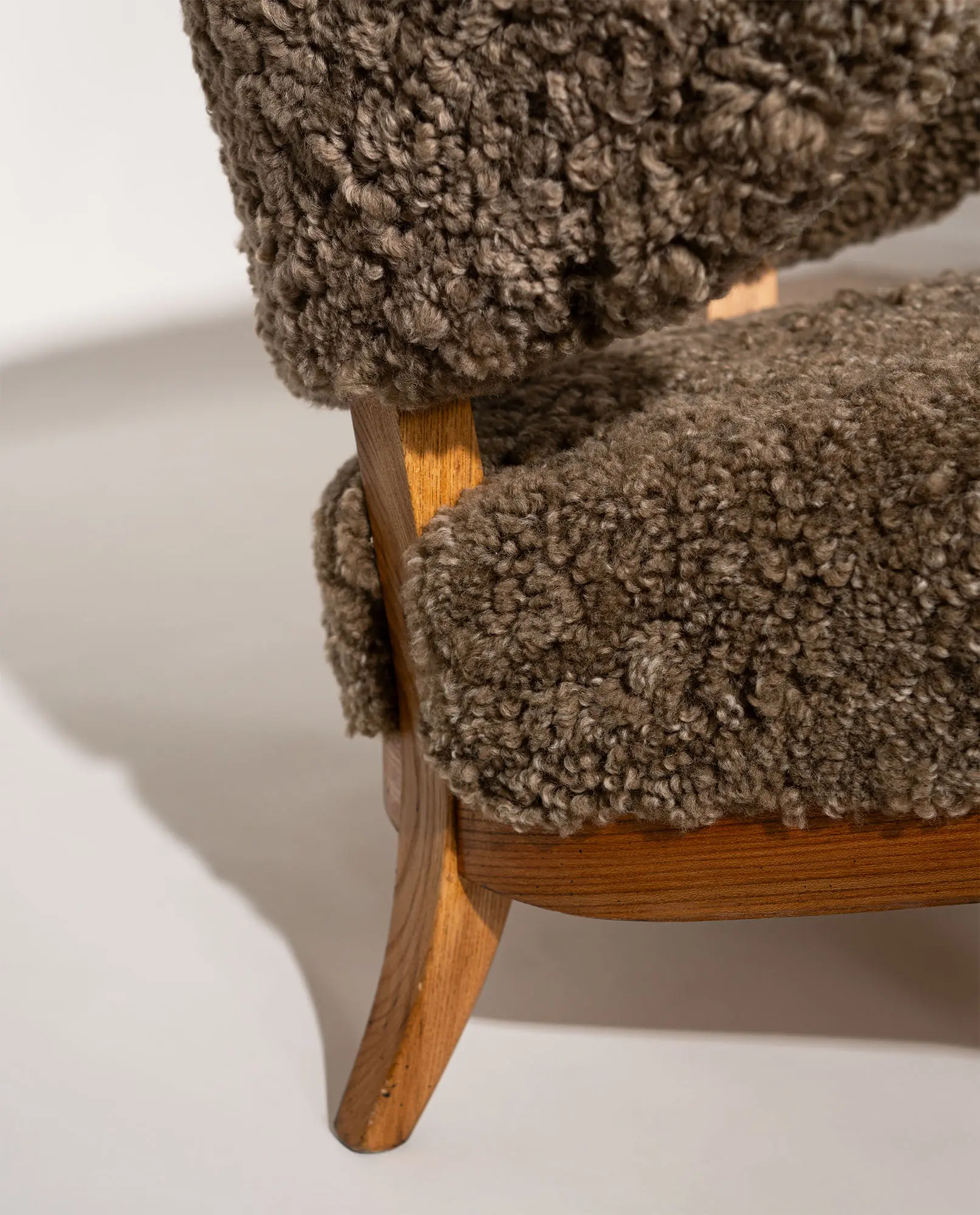 Upholstered in textured sheepskin, the organic volume contrasts beautifully with the exposed wooden frame and tapered legs. A sophisticated balance of structure and warmth, this armchair represents an exceptional example of early Scandinavian modernism.