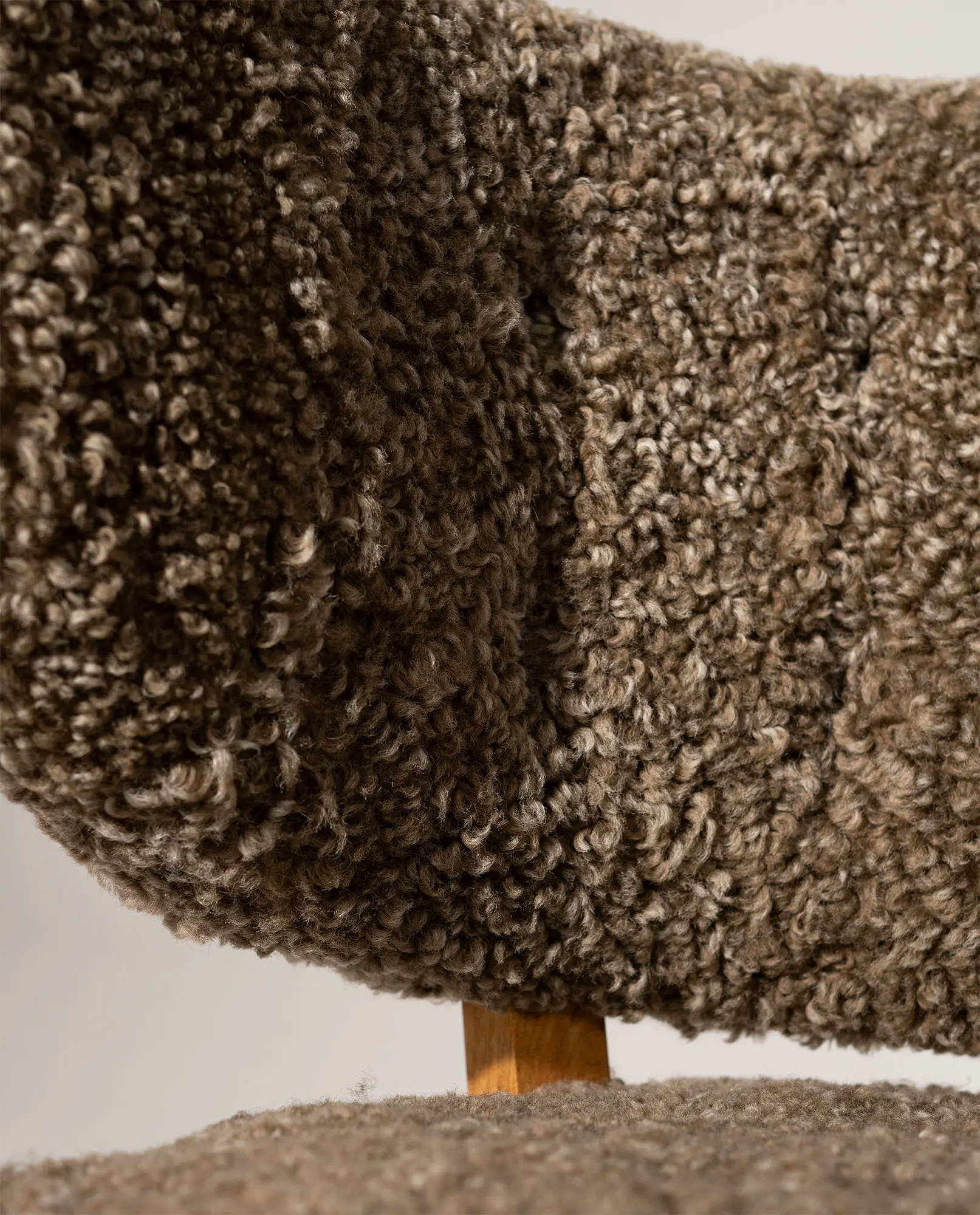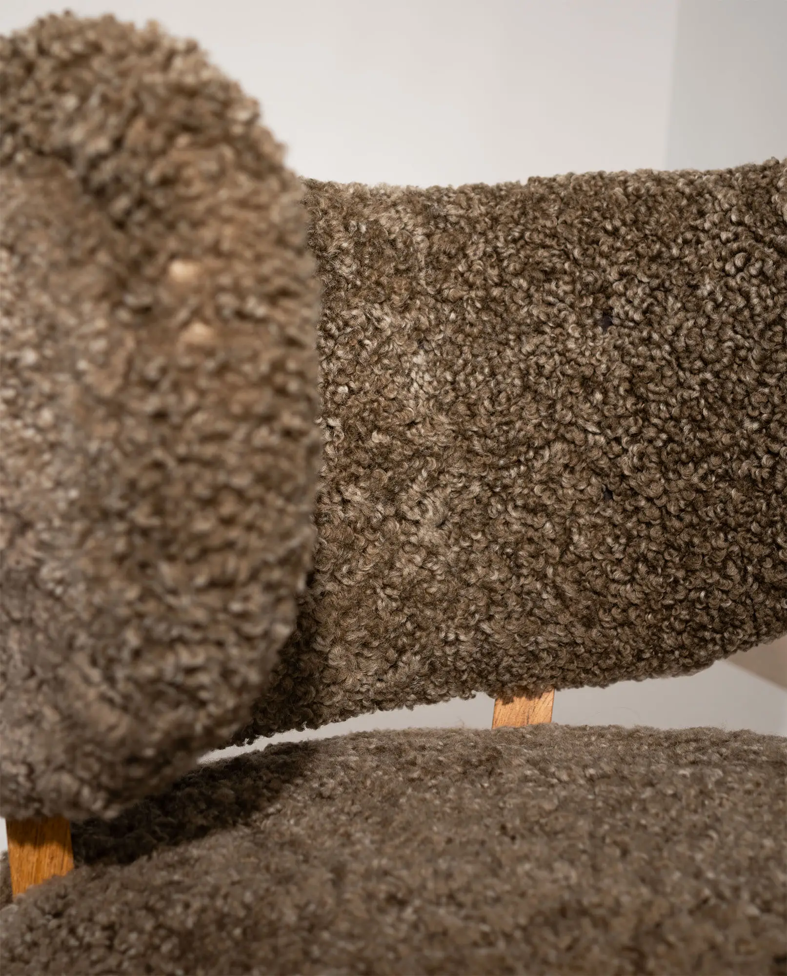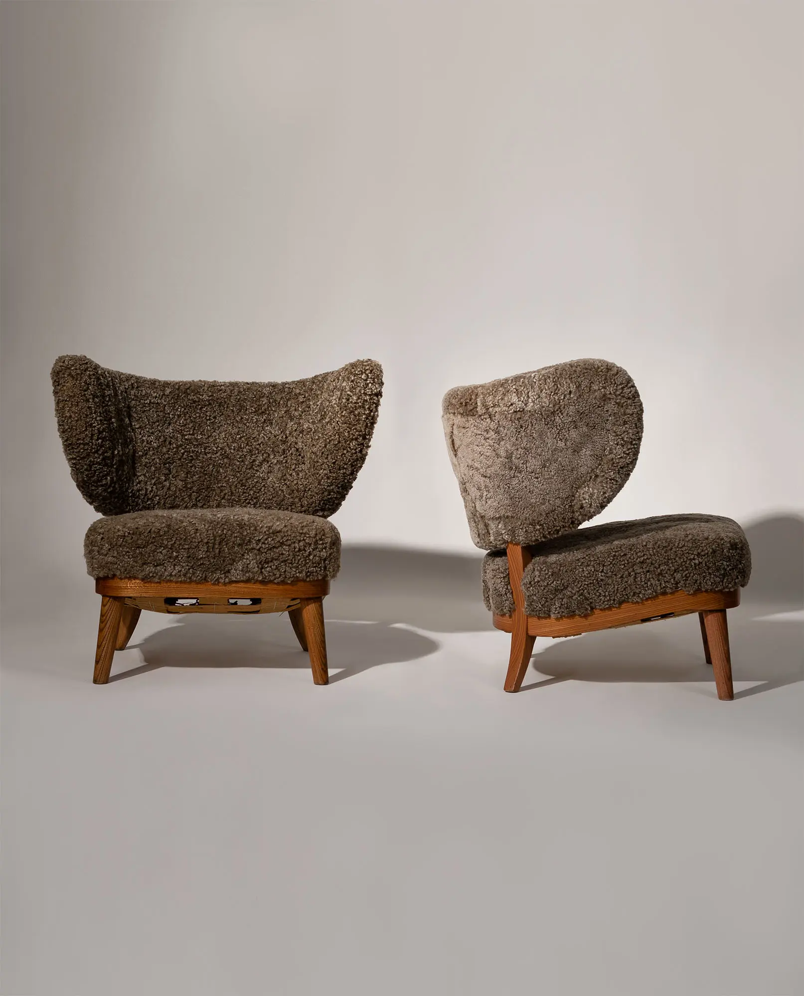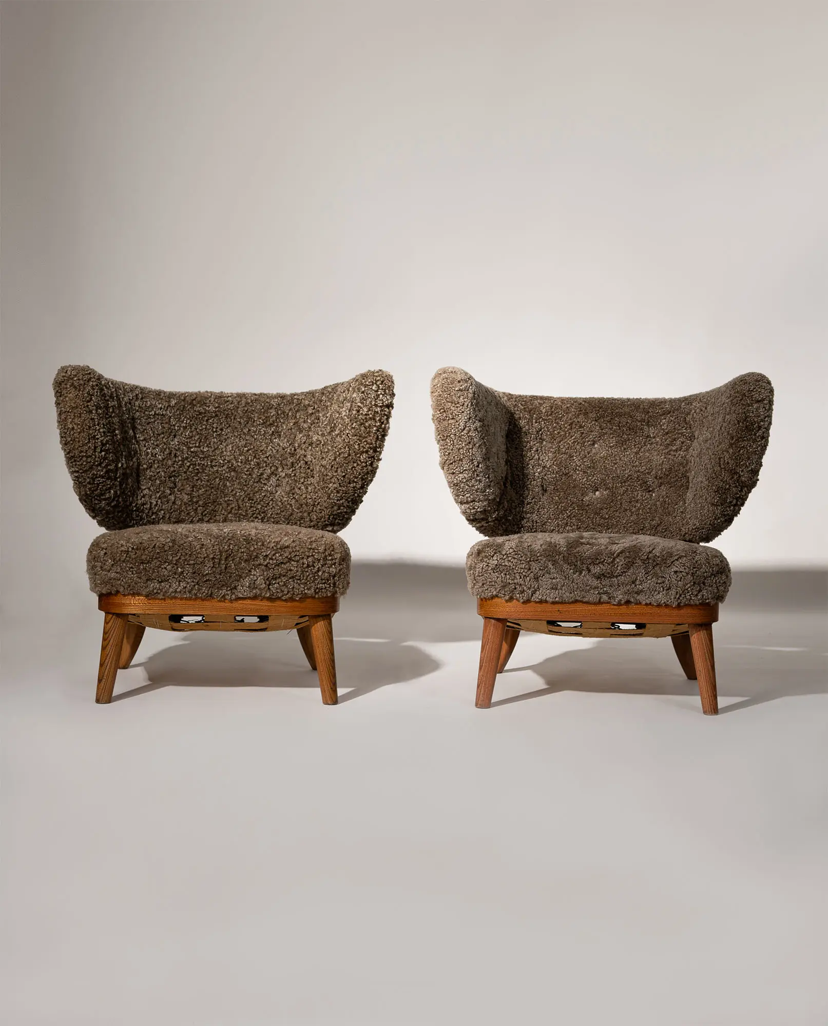 Upholstered in textured sheepskin, the organic volume contrasts beautifully with the exposed wooden frame and tapered legs. A sophisticated balance of structure and warmth, this armchair represents an exceptional example of early Scandinavian modernism.