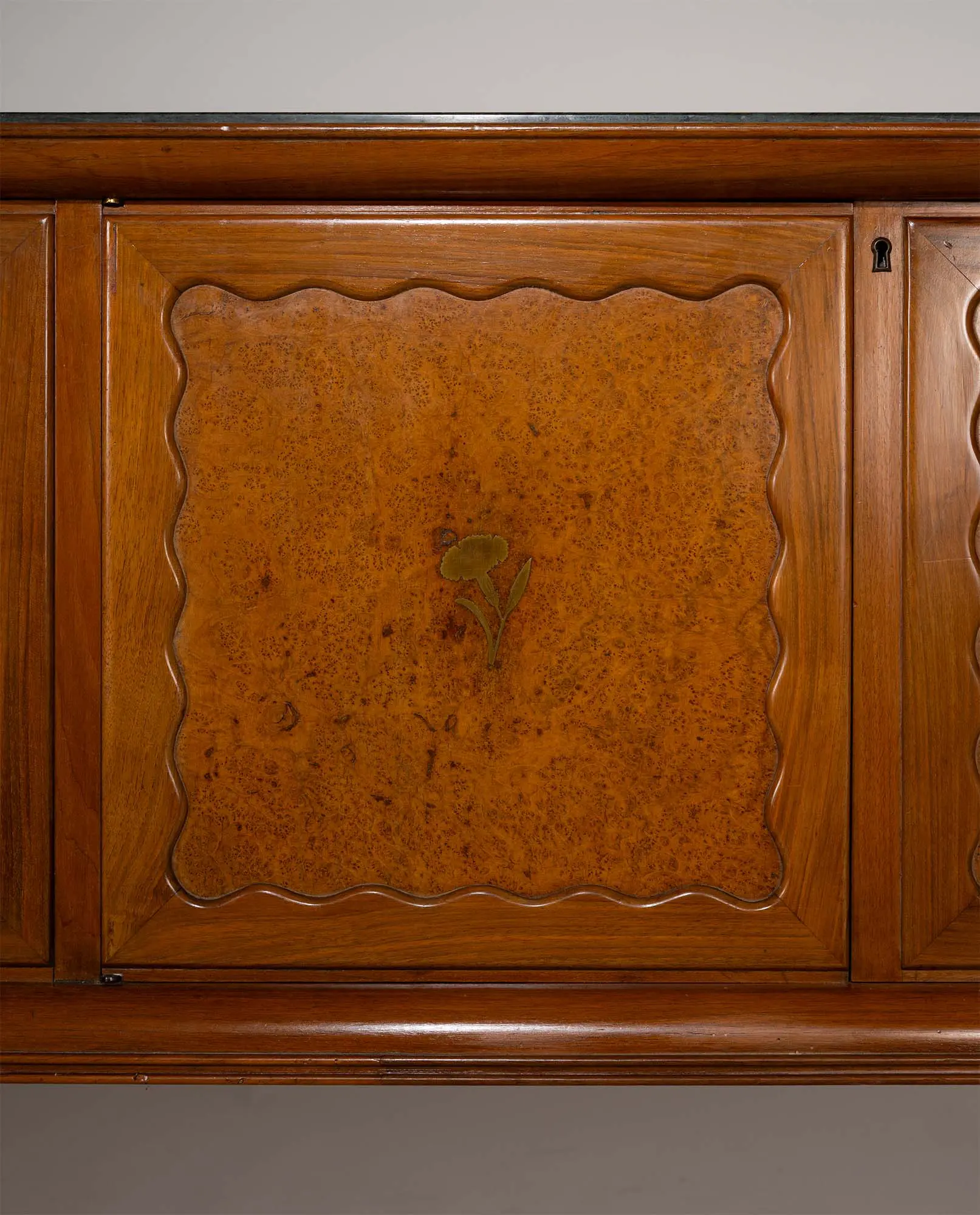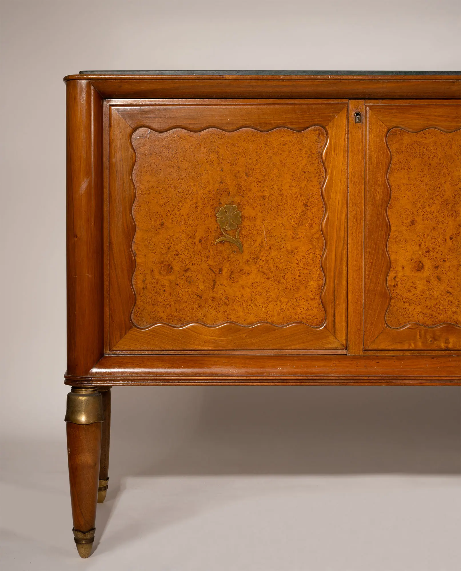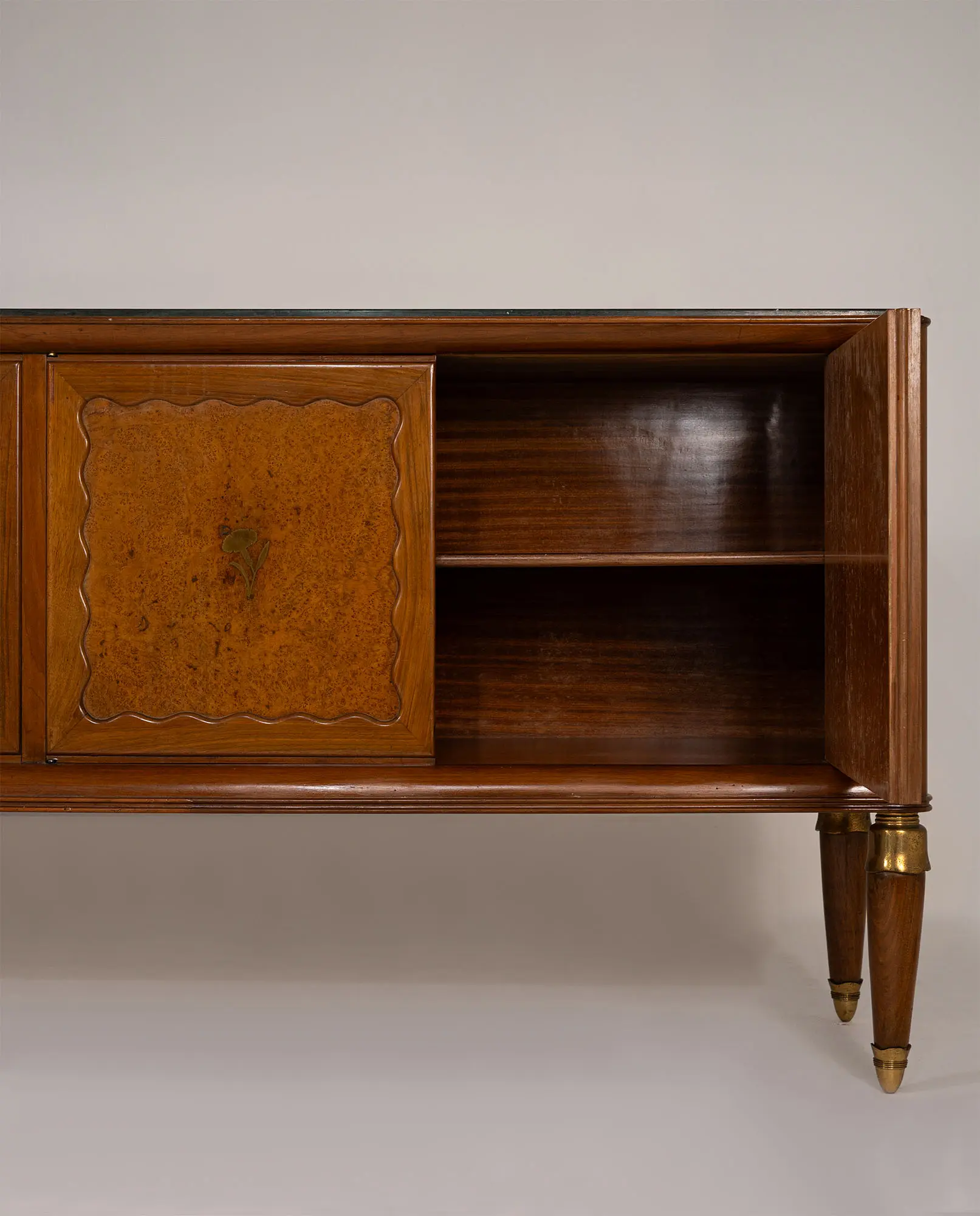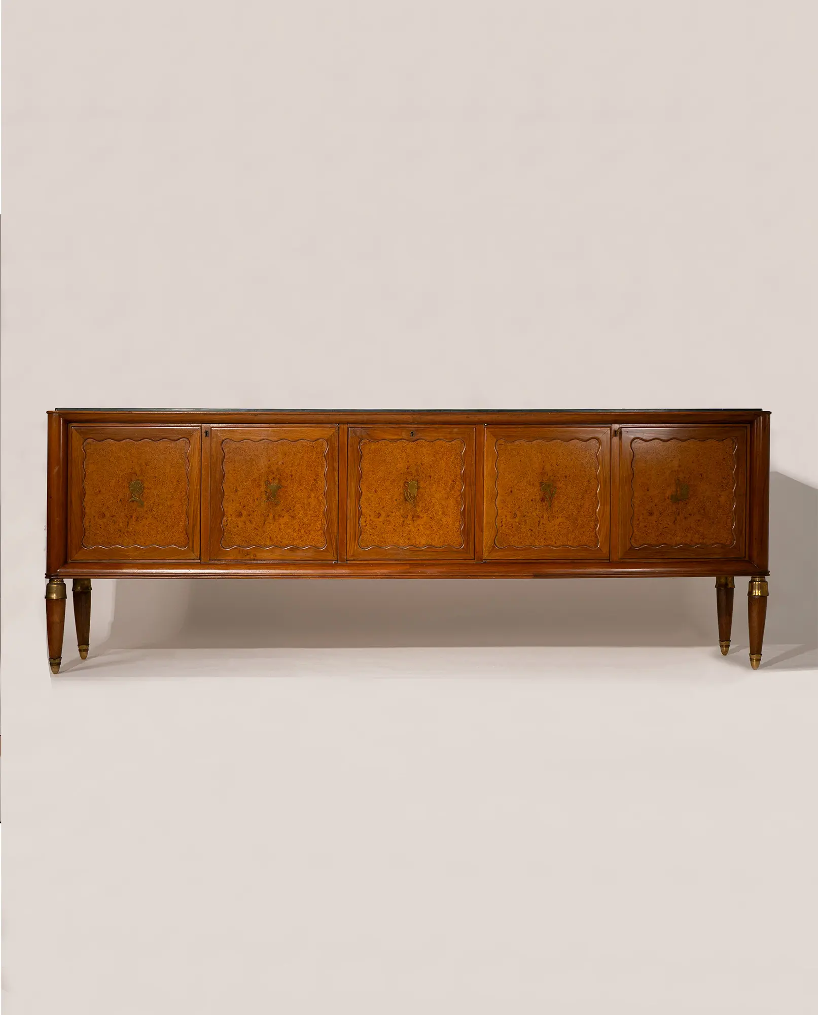 Italian sideboard by Paolo Buffa, 1956. Features a green Alpine marble top, five doors in walnut wood and birch burl with brass floral inlays, and four supports with elegant brass sabots, exemplifying high-quality craftsmanship.