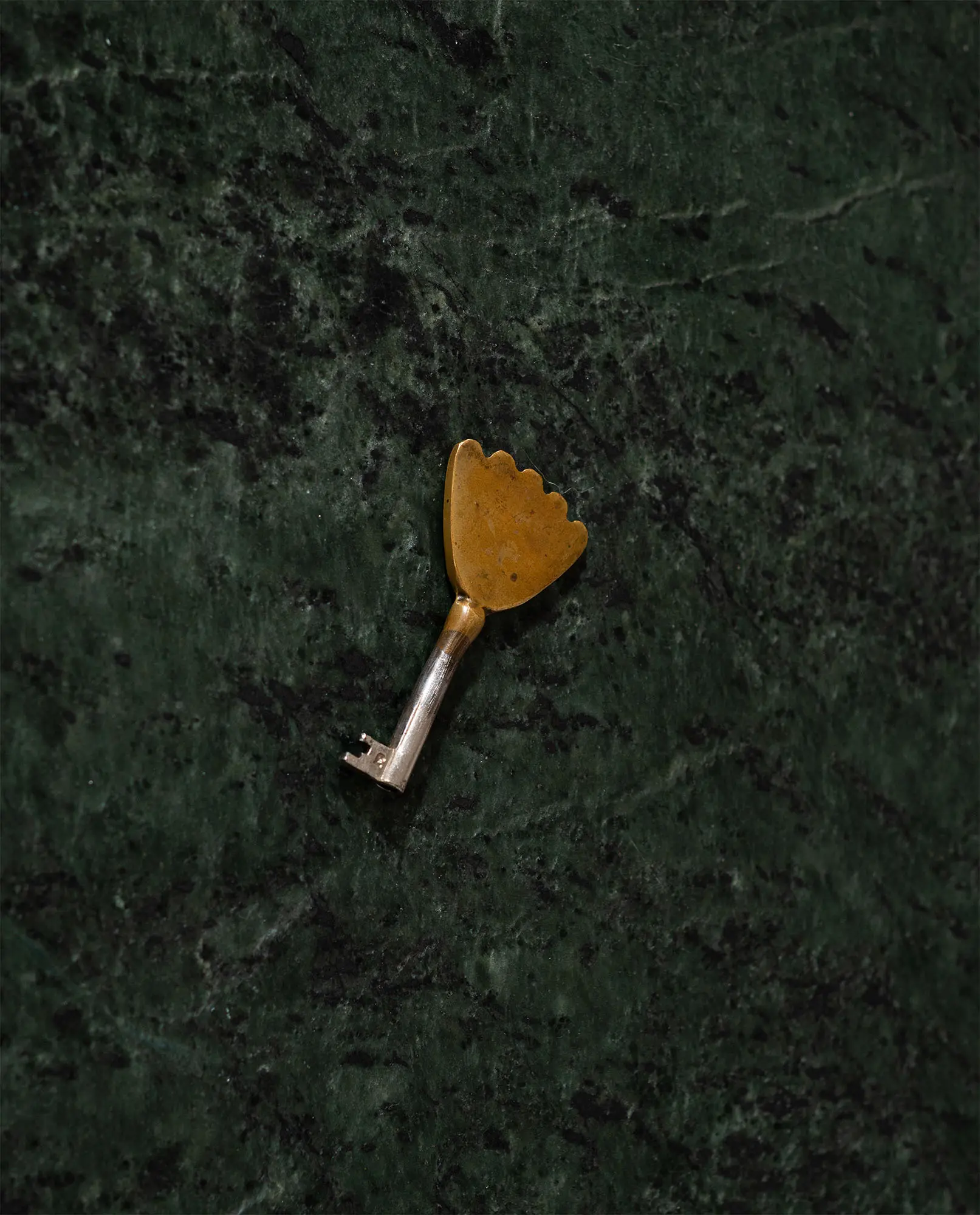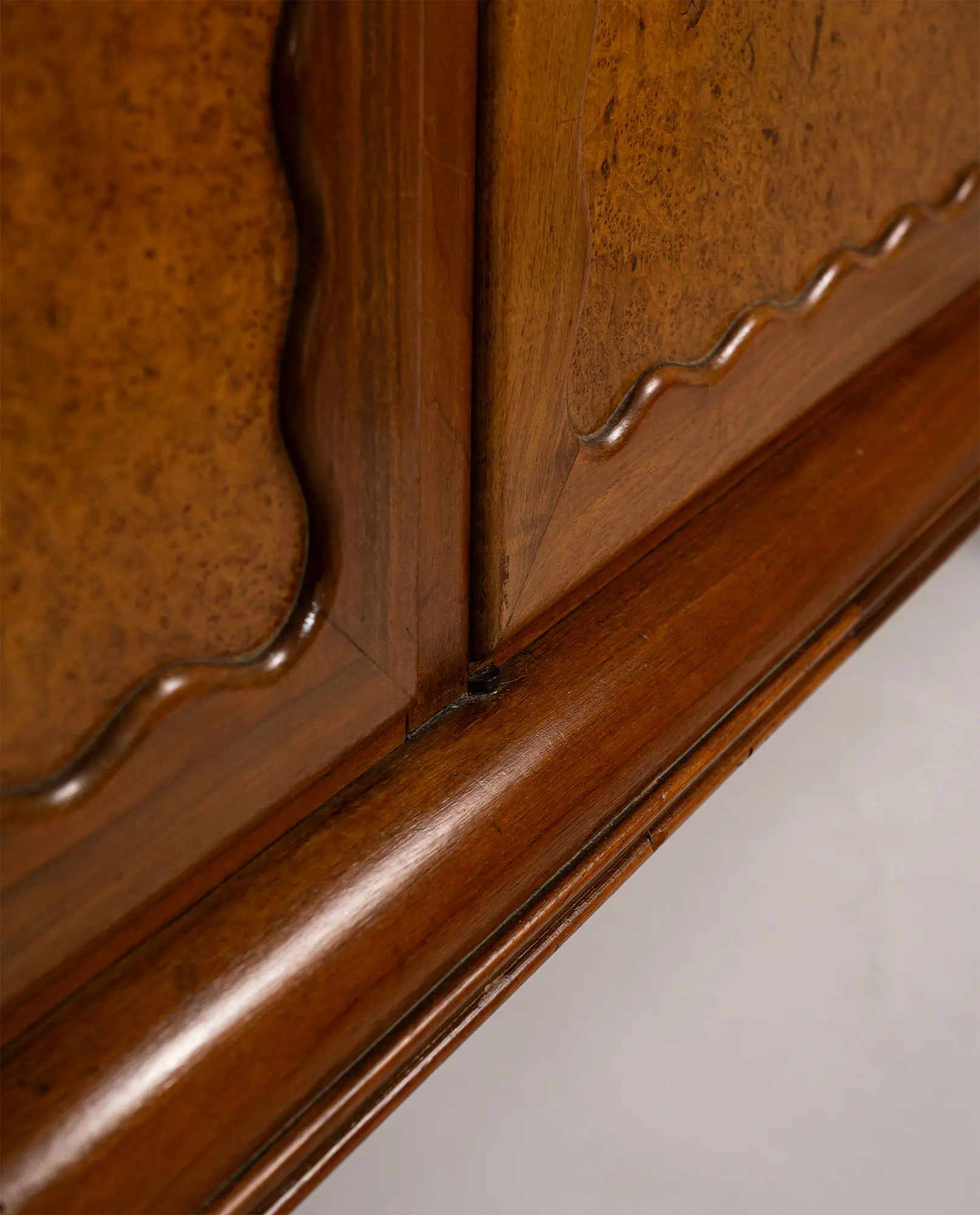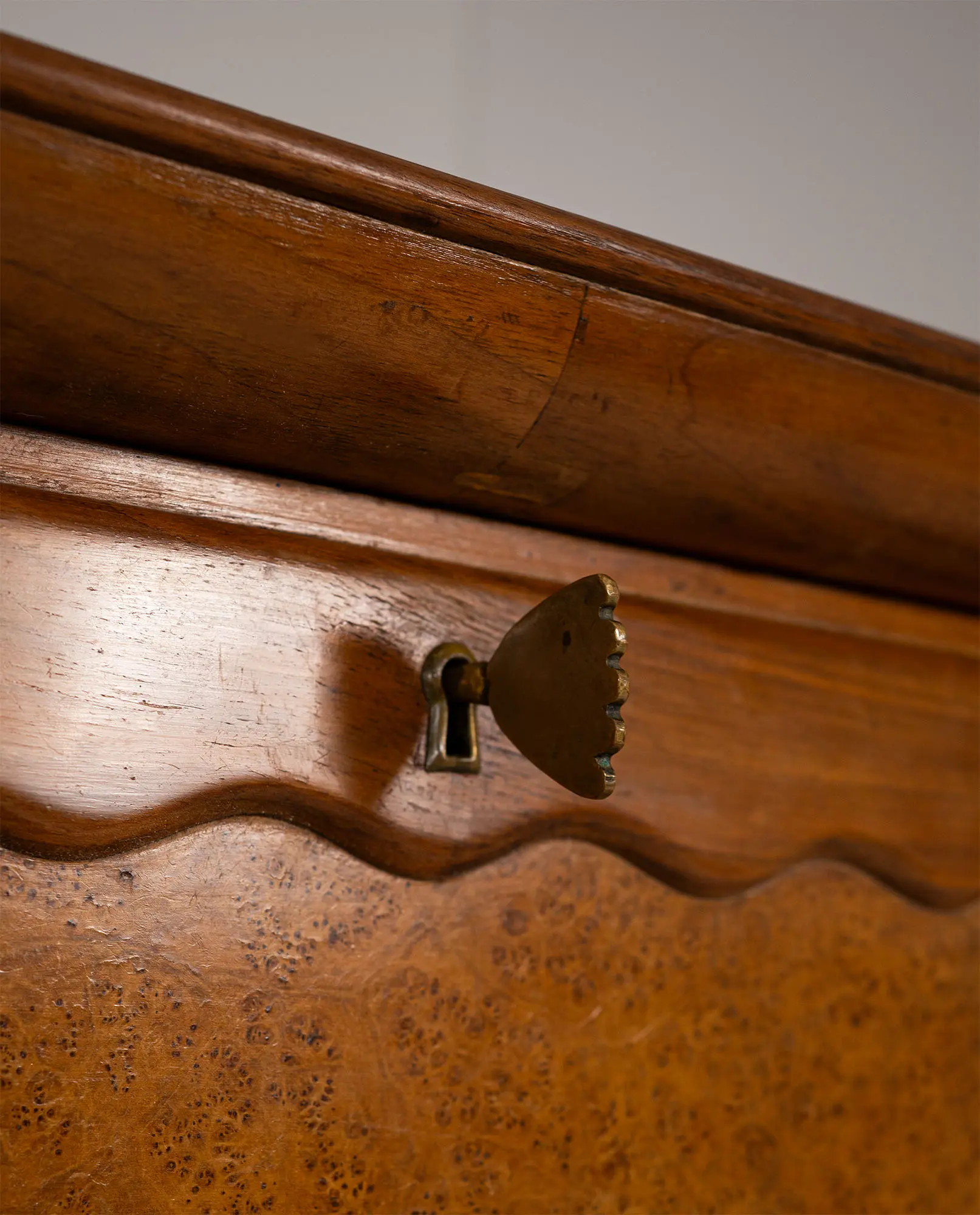 Walnut wood, birch burl, brass inlays, green Alpine marble