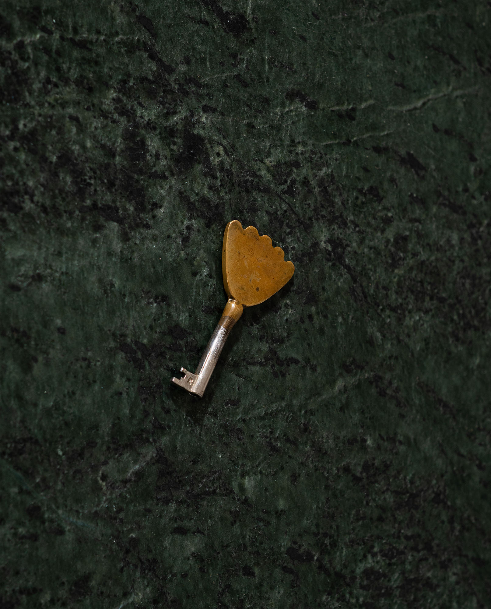 Material & finish | Walnut wood, birch burl, brass inlays, green Alpine marble |