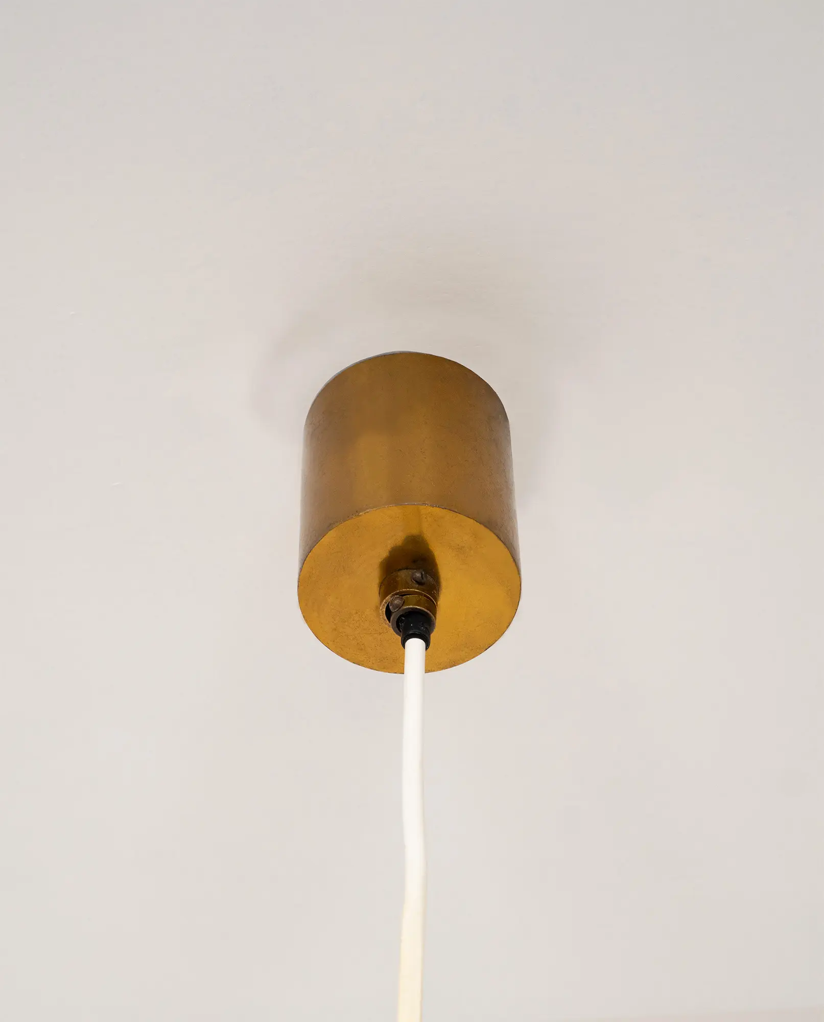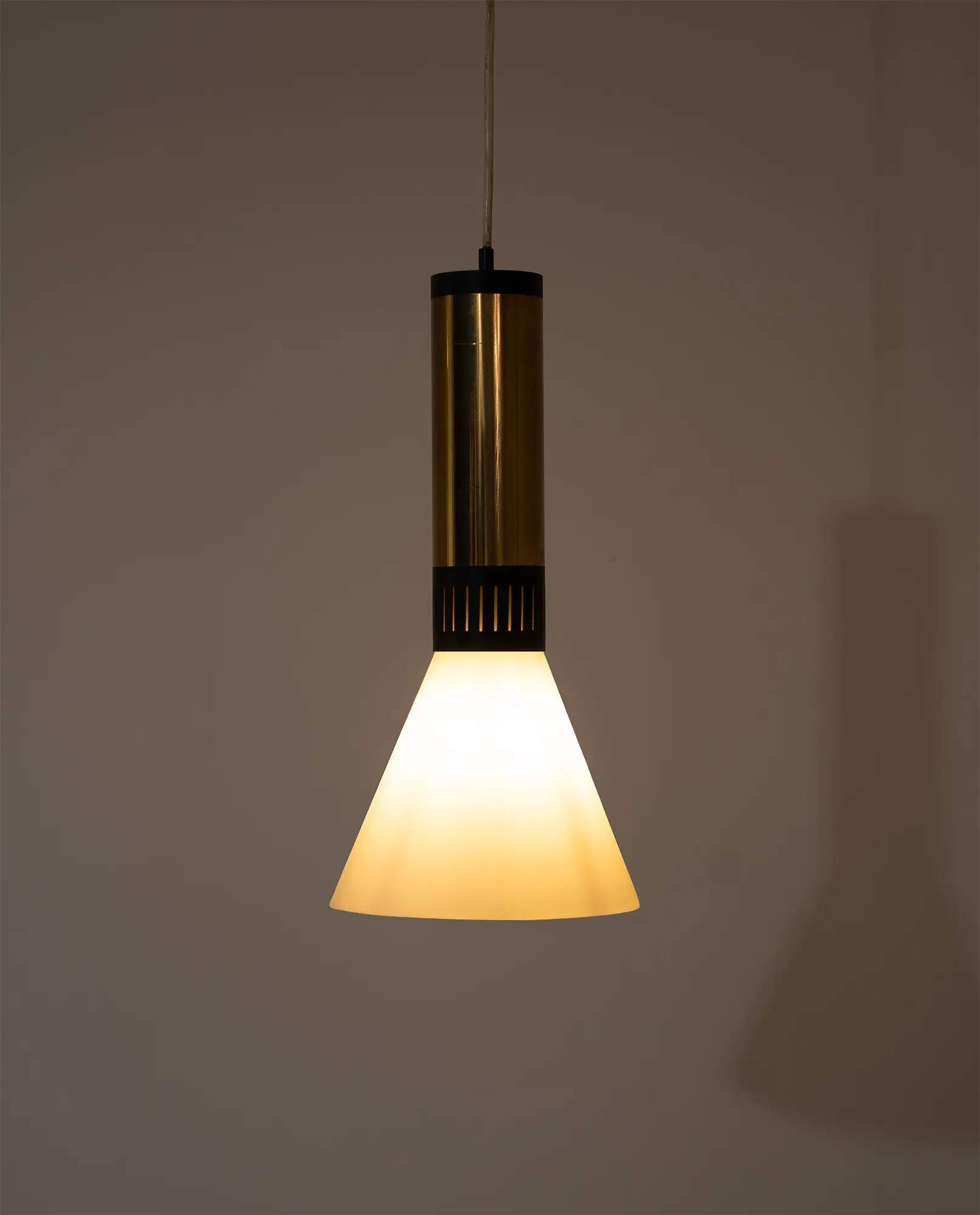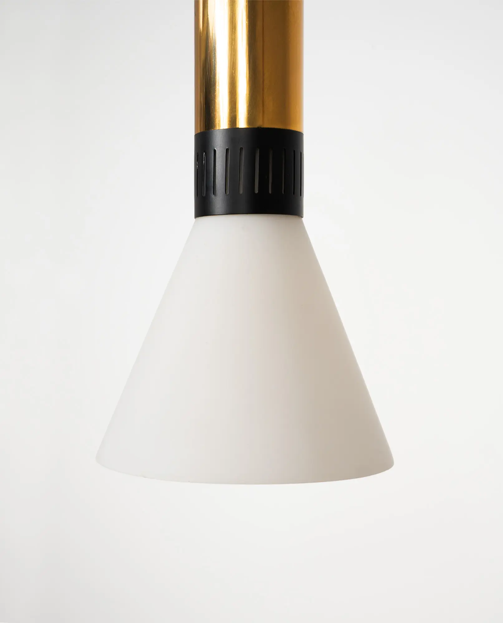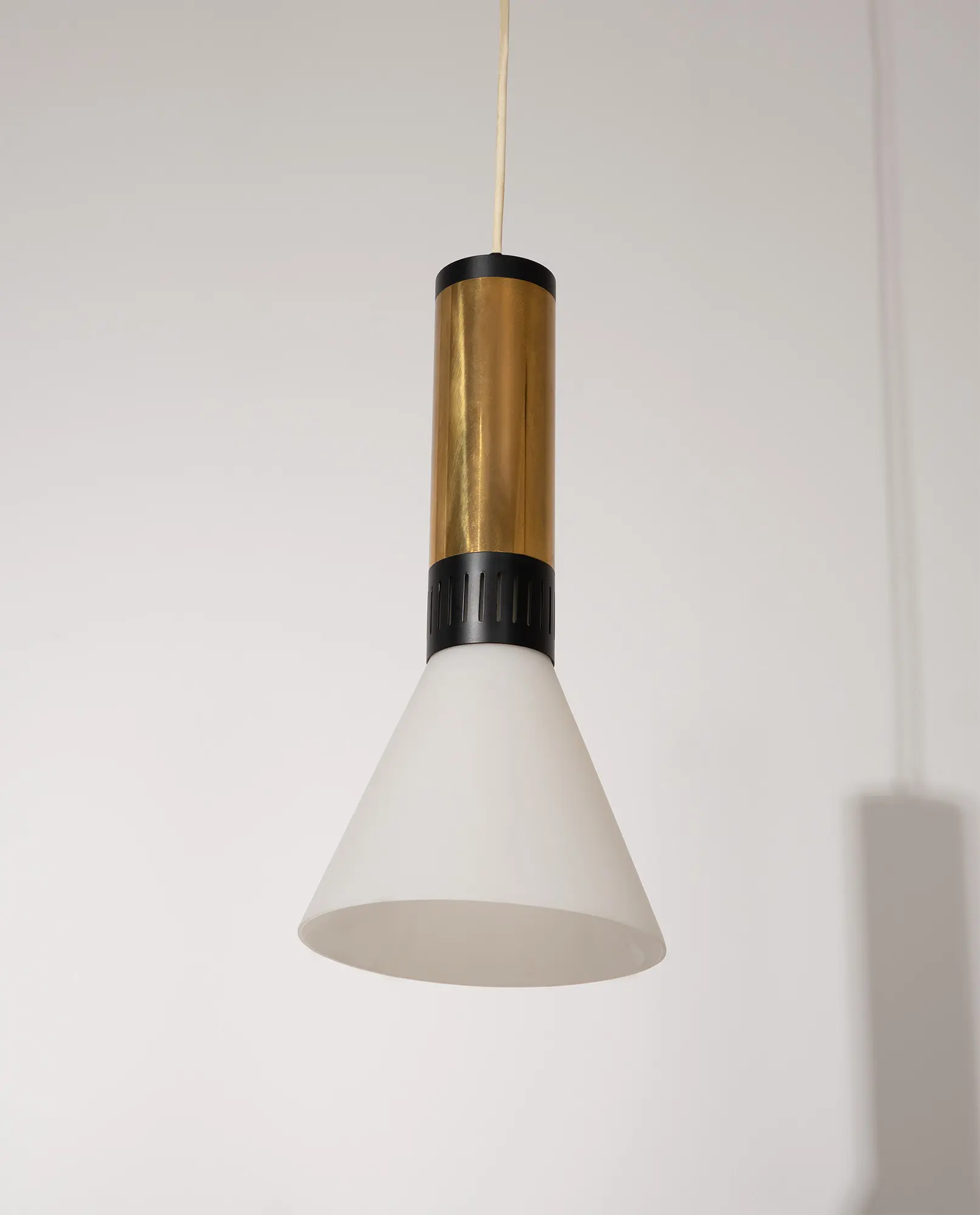 Pair of Stilnovo pendant lamps, model 1135/2, Italy, 1960s. Featuring conical milk glass shades mounted on brass tubes with matte black enameled collars and caps. Die-cut metal fittings create a decorative light effect, while the glass shades provide soft, diffused illumination.