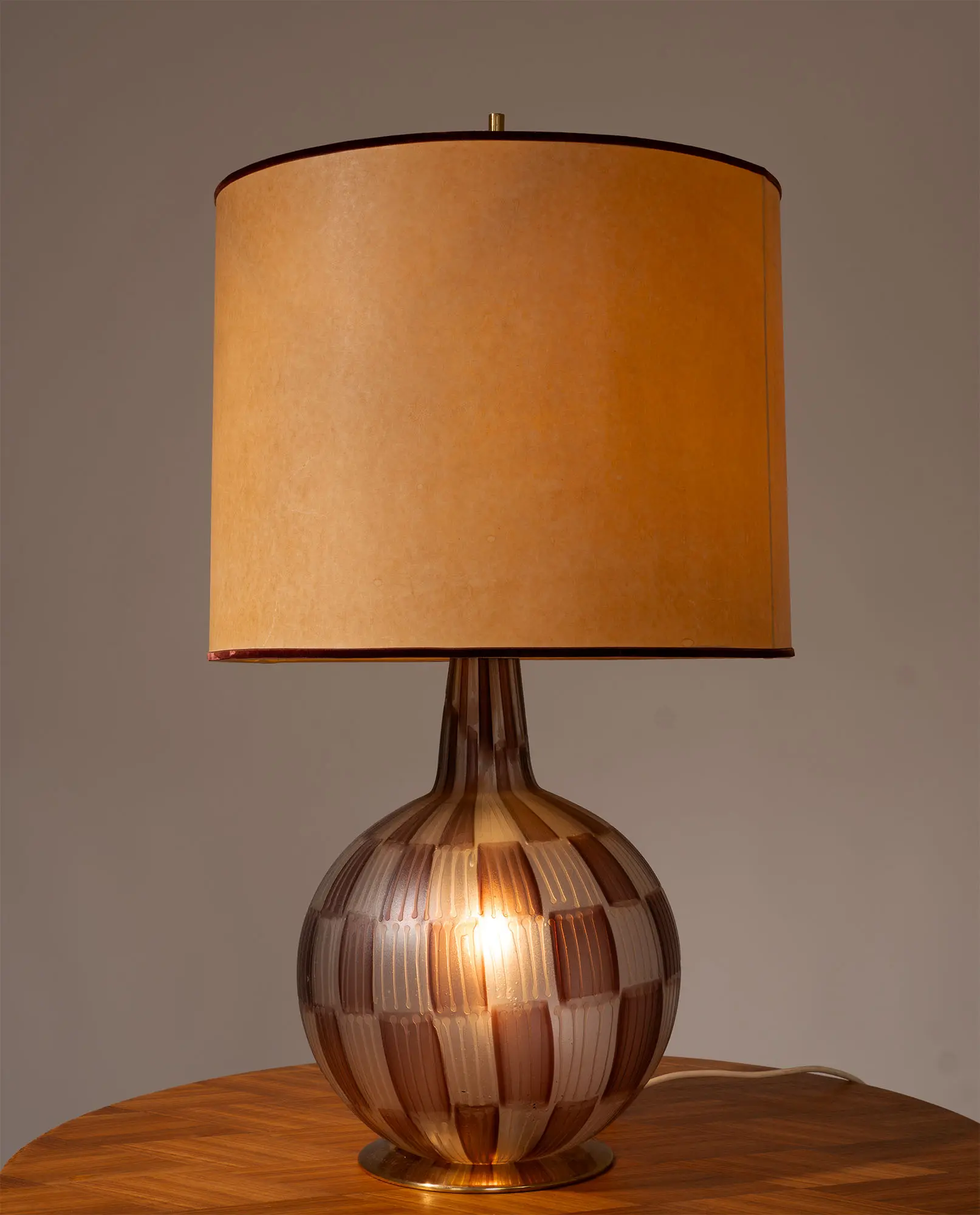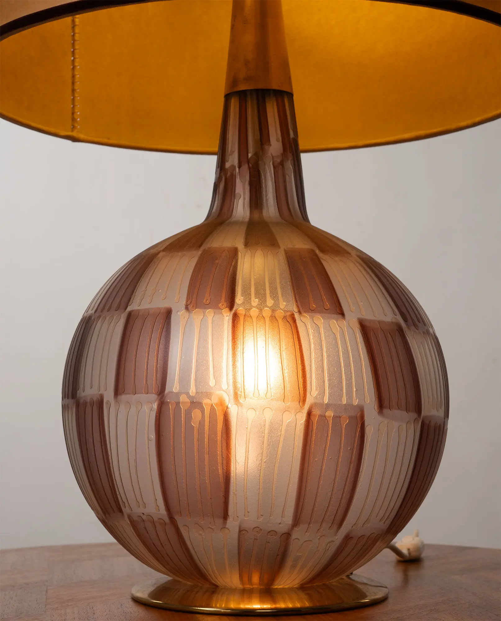 A refined mid-century modern table lamp in Murano glass and brass, designed by Tea Morosati for Stilnovo, 1950–1960, including the original lampshade. Showcasing Italian craftsmanship and elegant design, with hand-blown glass produced by Barovier & Toso.